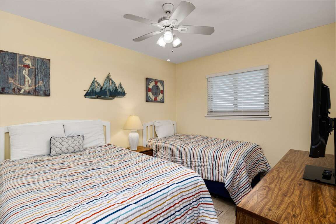 The 2-bedroom condo in South Padre Island, TX offers a comfortable and well-appointed bedroom setup for a restful stay. The spacious master bedroom features a queen bed and a flat-screen TV, providing a cozy and inviting atmosphere. The guest bedroom includes a full-size bed and twin beds, making it ideal for families or larger groups. It also comes with a flat-screen TV for additional entertainment options. The bedroom decor is tastefully chosen, creating a peaceful and relaxing ambiance. With these sleeping arrangements, guests can enjoy a good night's sleep and wake up refreshed and rejuvenated. Whether you're traveling with friends or family, the bedroom setup in this condo ensures everyone has their own comfortable space to retreat to at the end of the day.