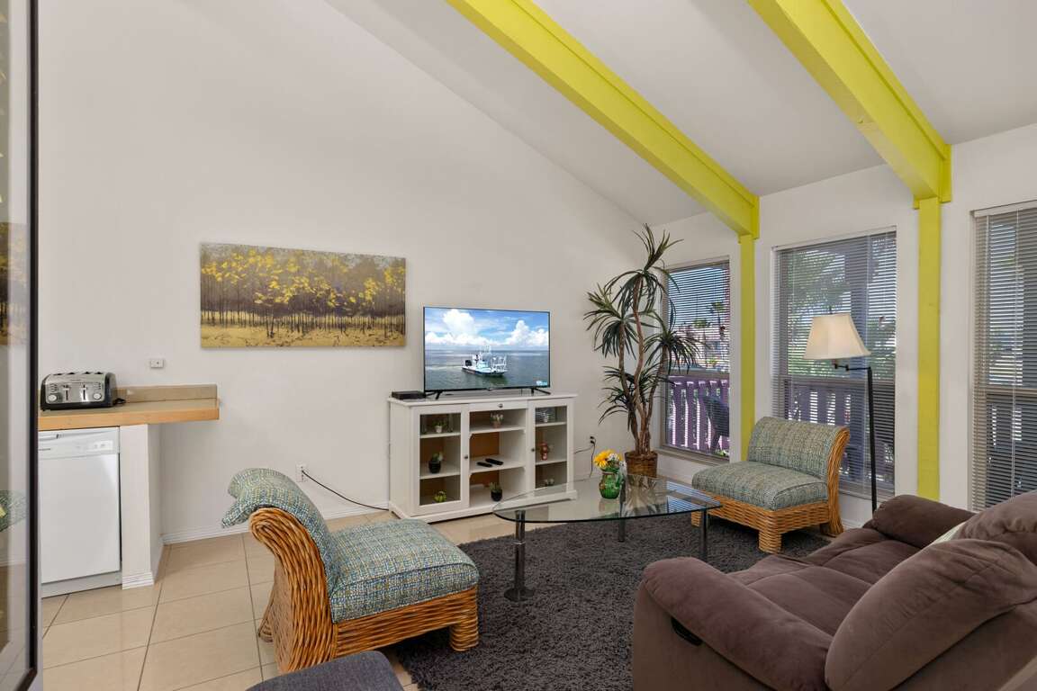 Villa #1 offers a spacious and inviting living area, complete with modern amenities and comfortable furnishings. The decor of Villa #1 reflects a bright and colorful coastal theme, creating a vibrant and cheerful atmosphere throughout. The open living room features a 3D flat-screen TV, perfect for entertainment and relaxation. Guests can also enjoy the cozy ambiance of an electric fireplace with adjustable temperature settings. The fully equipped kitchen is beautifully designed and includes all necessary utensils for preparing meals. Outdoor seating and decks provide additional space for guests to unwind and take in the surrounding views. Villa #1 also boasts a range of amenities, including access to a heated pool, hot tub, and tanning deck. With its charming decor and luxurious amenities, Villa #1 is the perfect choice for a memorable and enjoyable stay.