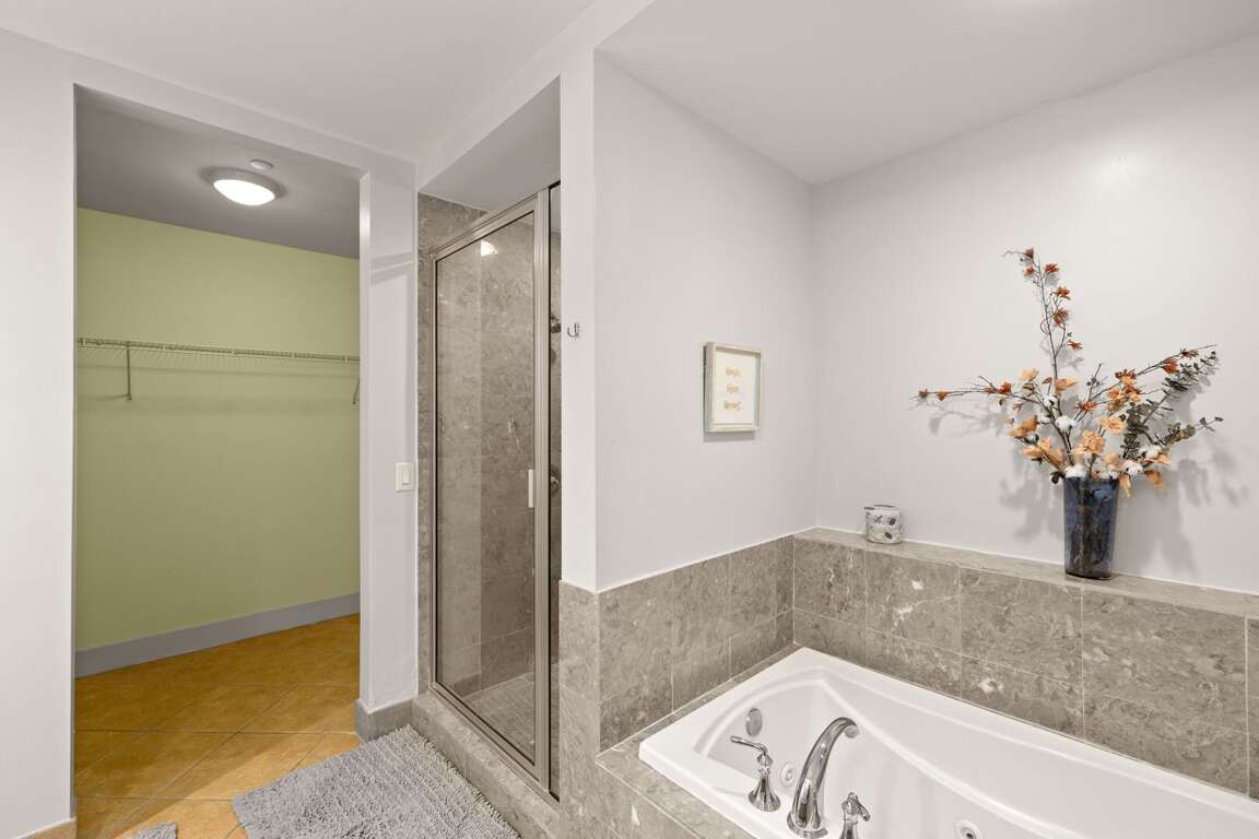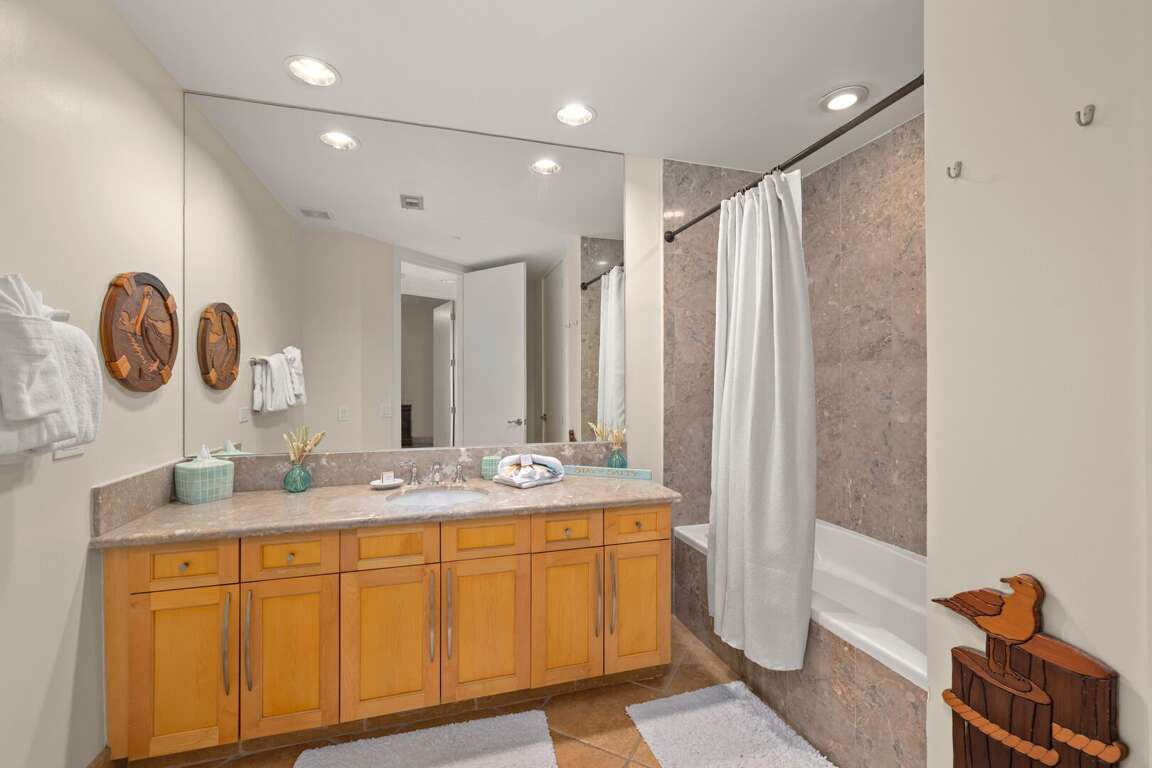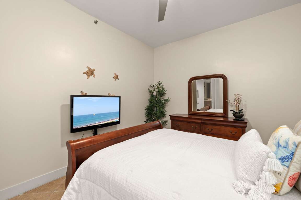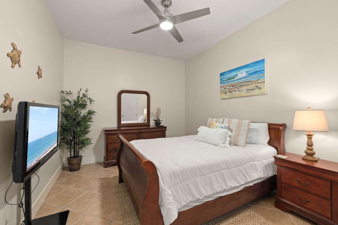 Unwind in the master suite, featuring a King-sized bed, flat-screen TV, and a private bath complete with a large jetted tub and walk-in shower. The guest bedroom offers a comfortable Queen bed and flat-screen TV, with easy access to a spacious second bathroom featuring double sinks and a tub/shower combination.<br />