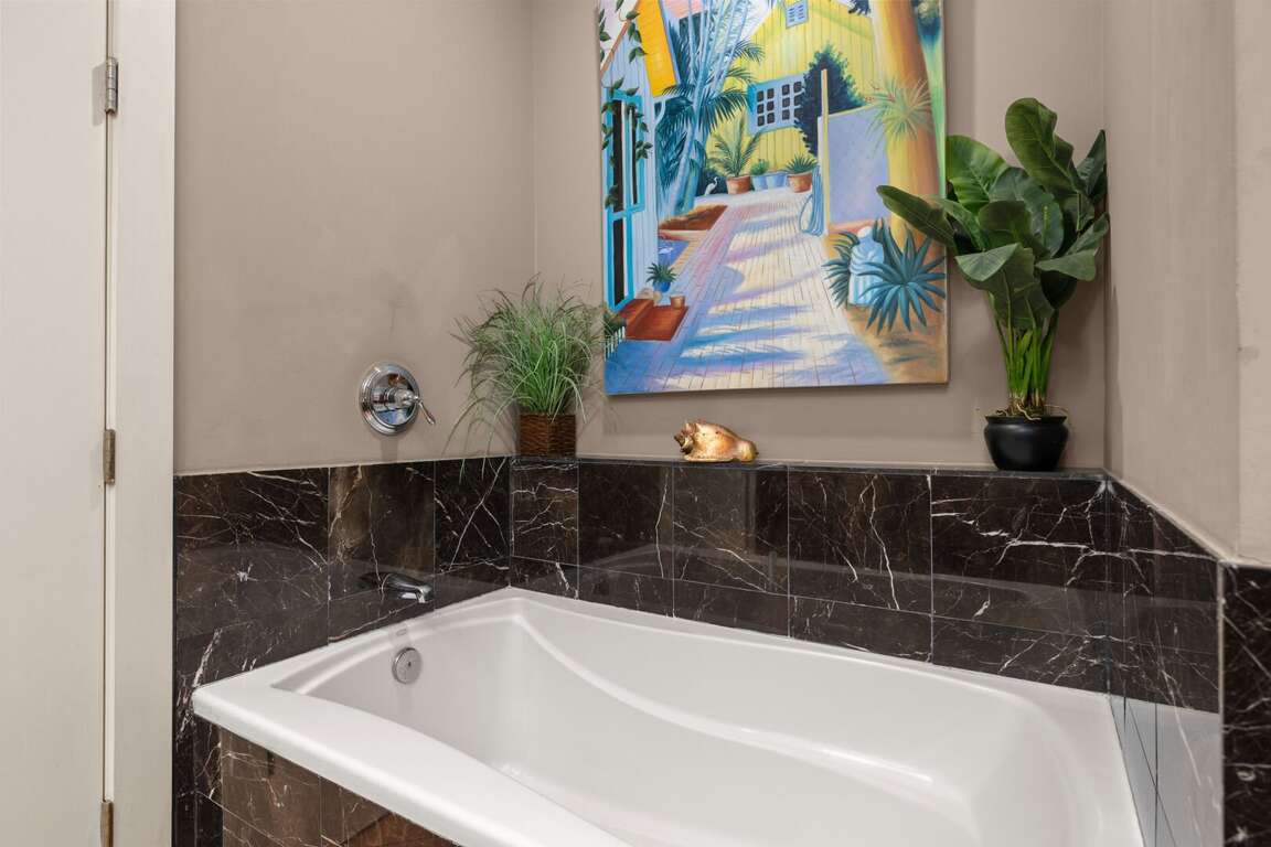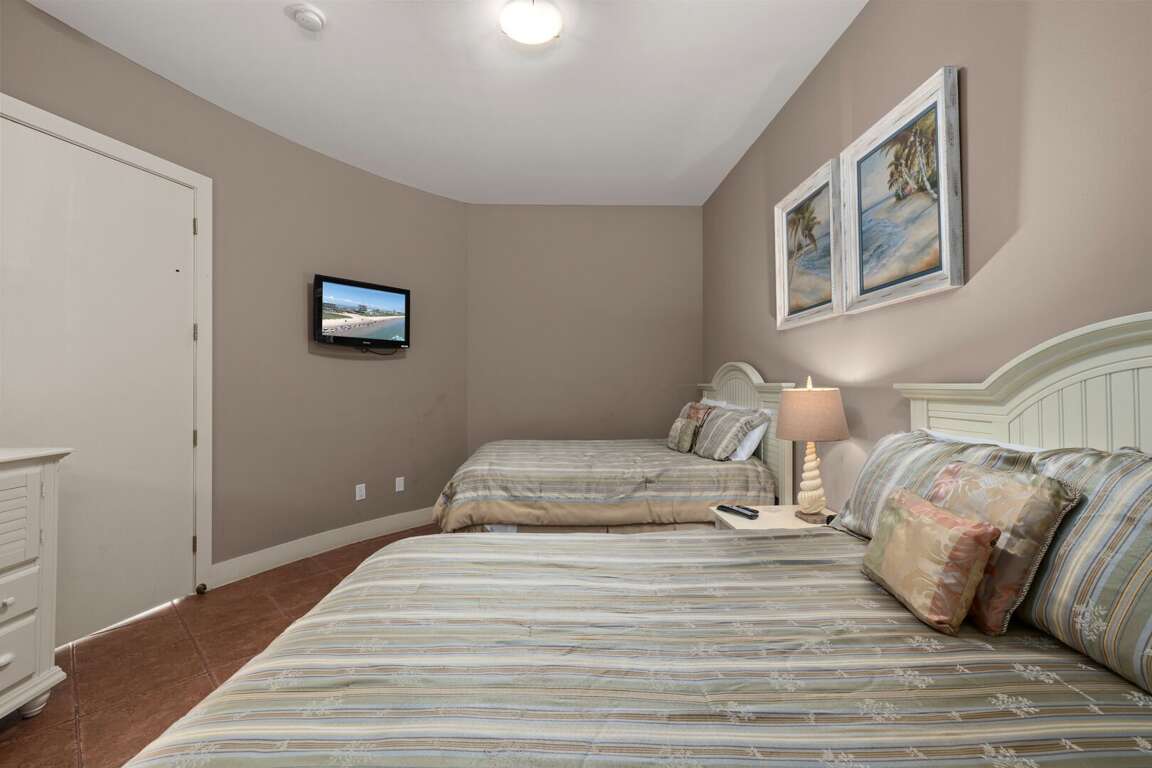 You’ll rest peacefully in the master bedroom, which features a sumptuous king-sized bed and expansive windows with stunning views of the pool and Gulf of Mexico. The private master bathroom includes double sinks, a walk in shower, and a soaking tub to help you unwind. Guests will enjoy comfortable accommodations with two full beds in the second bedroom and twin beds in the third bedroom. A shared guest bathroom offers a soaking tub and walk-in shower.<br />
