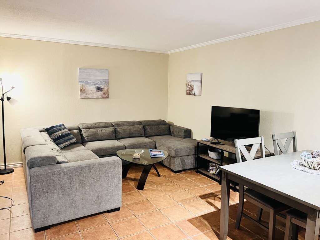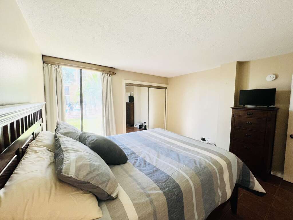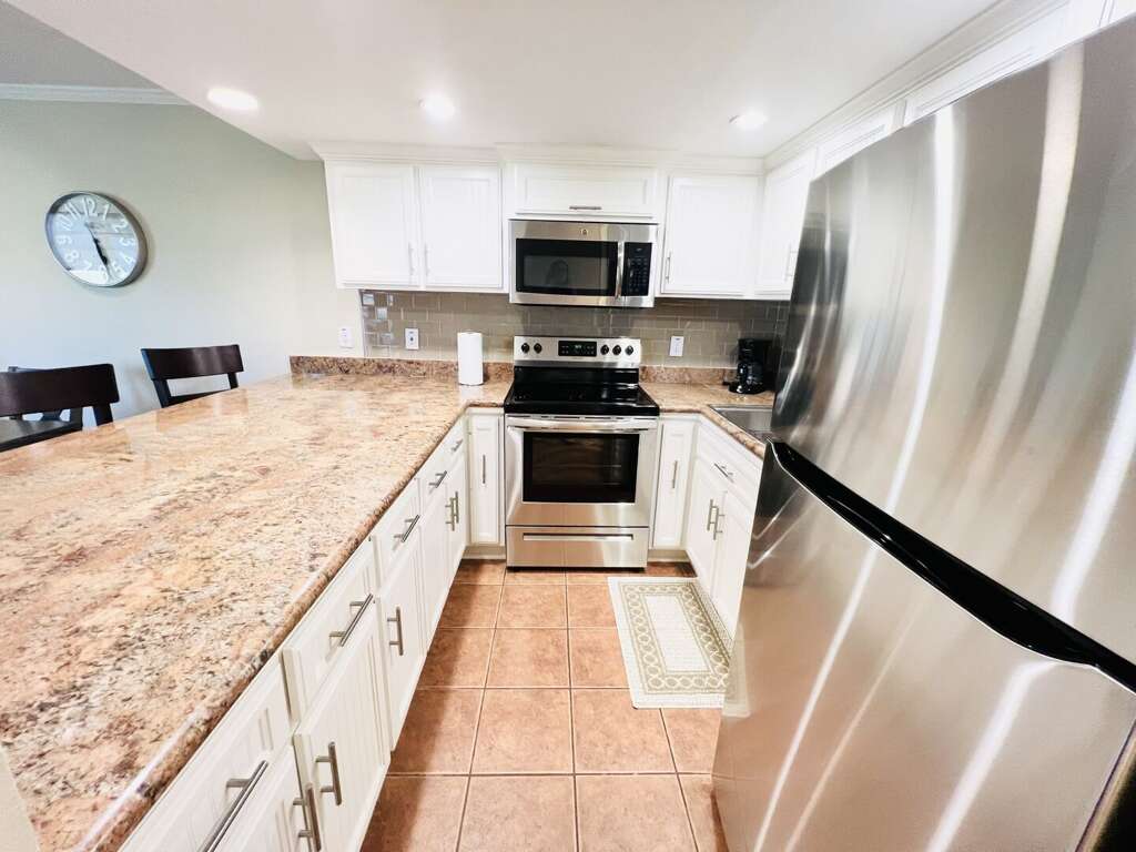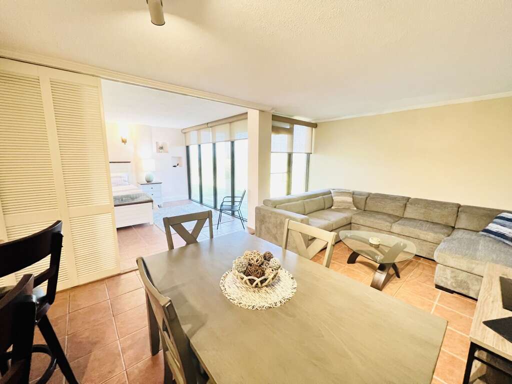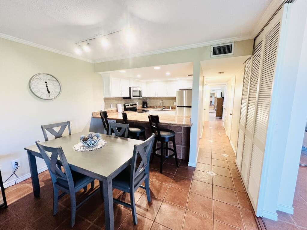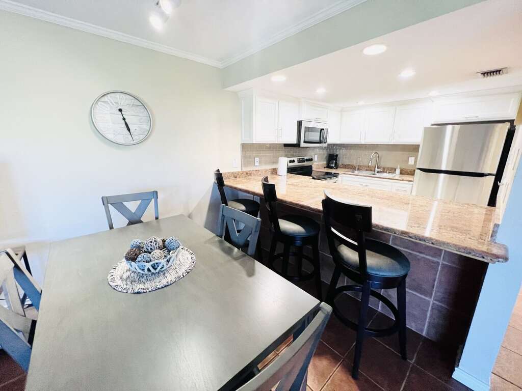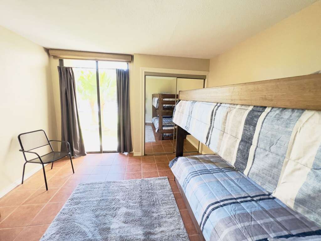 Inside, the condo features an open living and dining area with comfortable seating, natural light, and a fully equipped kitchen with stainless steel appliances and ample counter space. Sleeping arrangements include a spacious primary bedroom with a king bed, a guest bedroom with a queen bed, and a bunk bedroom with twin beds. The condo sleeps 7 guests in beds, with a maximum occupancy of 8, making it a flexible option for families or groups traveling together. Sliding glass doors provide access to outdoor areas while allowing plenty of natural light throughout the space.<br />