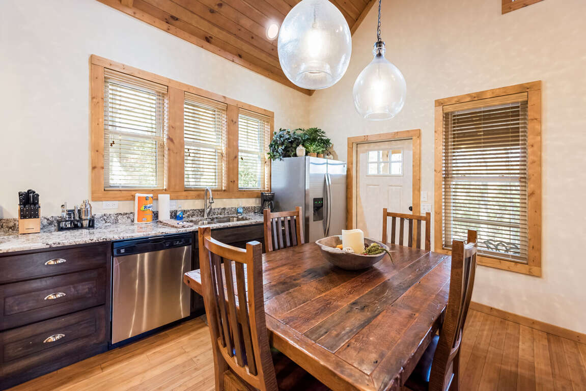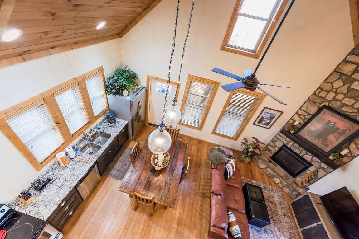<p><span style="font-size:18px;"><span style="font-family:Arial,Helvetica,sans-serif;"><strong>Main level: </strong>Bamboo floors and expertly curated furnishings give this cabin the charm and comfort of a boutique stay. Plush seating around the floor-to-ceiling stone fireplace makes for a comfortable living area you can curl up in. The kitchen comes fully equipped, complete with stainless steel appliances and granite countertops. </span></span></p>