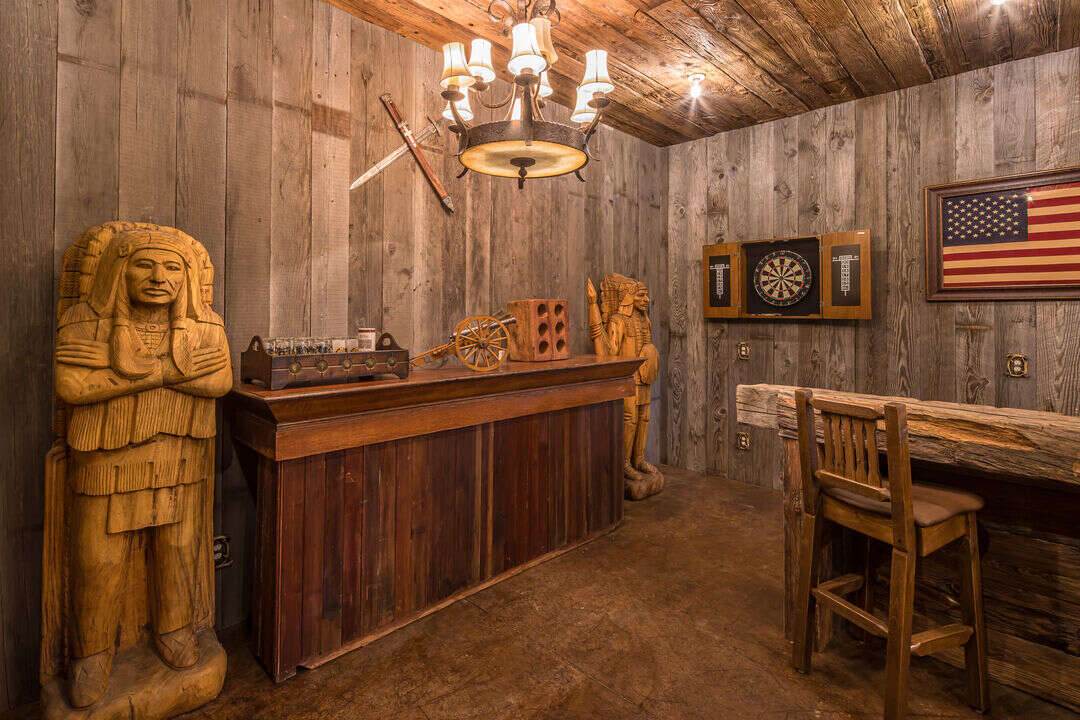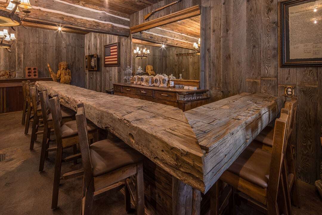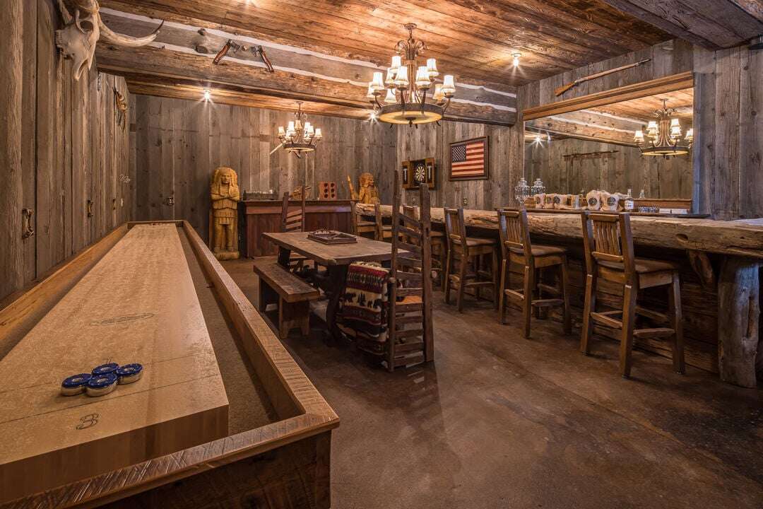 Step outside and discover a private entertainment hideaway — a space designed not just to be seen, but to be experienced. At its heart, reclaimed wood from the year 1850 anchors this space. With seating for eight at the bar and 6 at the table, this intimate retreat invites connection and conversation. A rustic, custom made 20 foot long Dakota shuffleboard table and dartboard set the stage for relaxed play and shared moments. Authentic antique pieces and warm lodge lighting create a rich, transportive atmosphere as if you have stepped into the Old West. Perfect for corporate and private gatherings, or après-ski wind-downs, this is an ideal setting for the celebratory moments, or simply unplugging in old Montana style. Exclusive Access is offered as a premium add-on. This space is reserved for guests seeking something truly distinctive and memorable. Please contact Stay Montana for details.