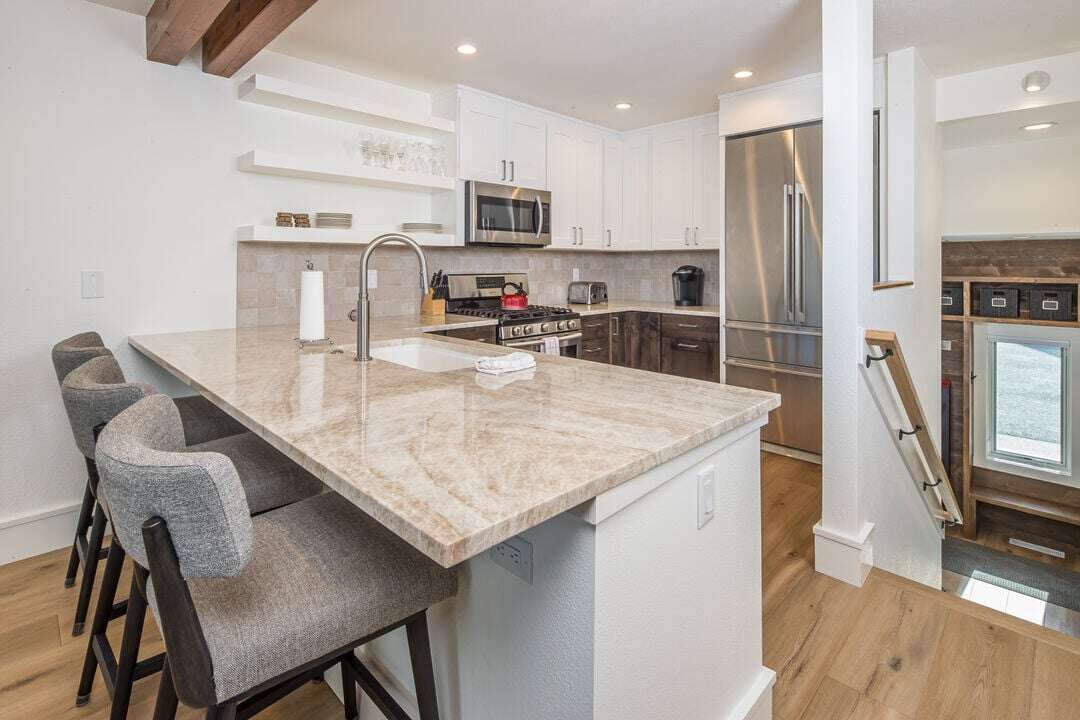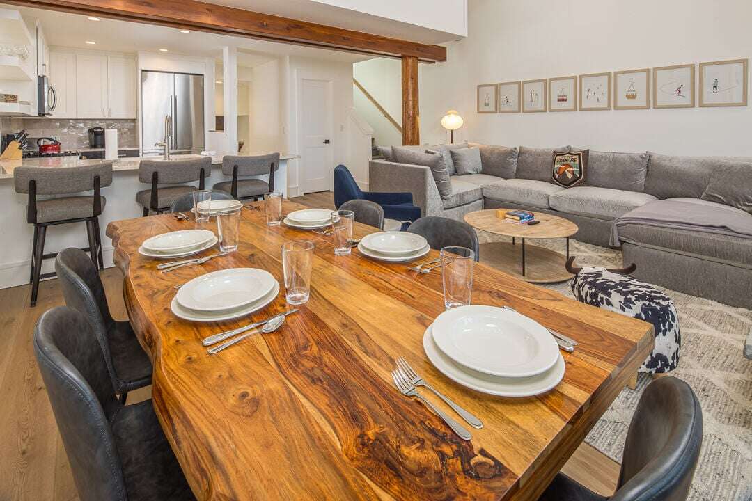 The open-concept living area is a cozy haven after a day of outdoor adventures, featuring a stone fireplace, plush furnishings, and an upper deck that showcases our breathtaking mountain views. The fully equipped kitchen with modern appliances is ideal for whipping up delicious meals, and the dining area seats everyone comfortably for family style dinners. The private hot tub on the lower deck provides a soothing après-ski experience under the starry Moonlight sky.