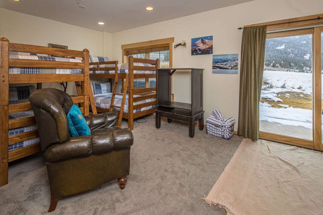 The lower level serves as the main entry point to the home, with a coat rack and a space to kick off your boots and leave your gear. This level includes a fourth bedroom with two twin-over-twin bunk beds and its own casual living area with a couch, great for younger guests or additional family members. You'll also have direct access to the outdoor patio with the private hot tub and grill.