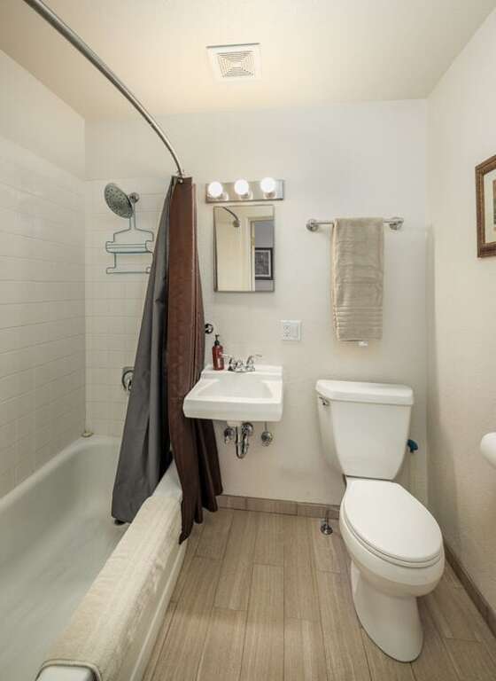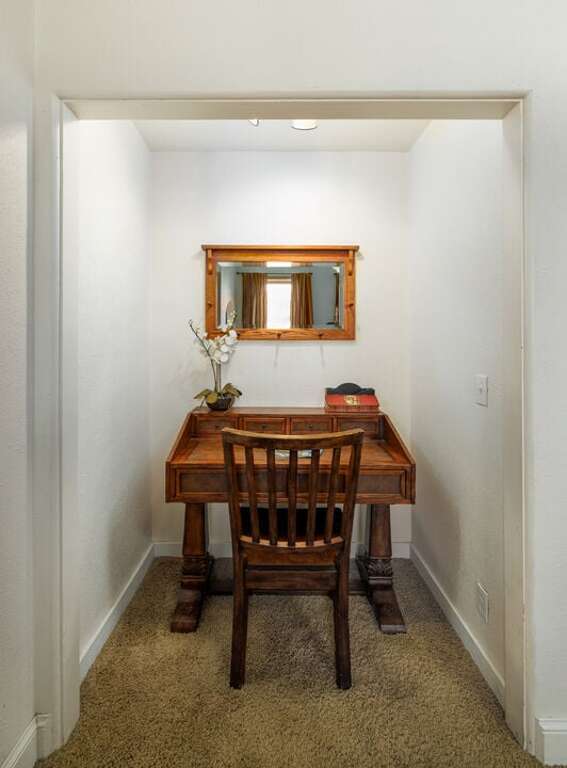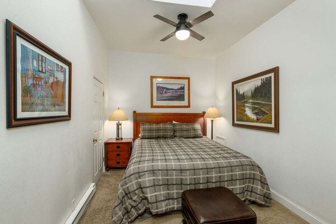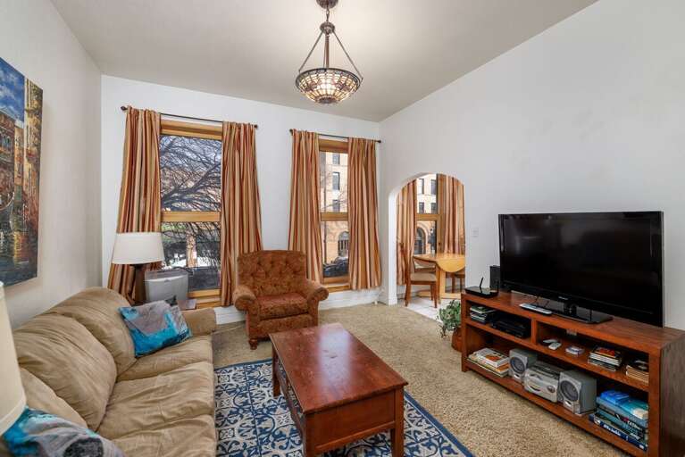 The bedroom features a pillow-top bed, skylight, and rich cherry furnishings, and the bathroom has a shower/tub combo perfect for relaxing after exploring Bozeman. The living space is warm and inviting. With a queen sleeper sofa, and cozy accents. A dedicated work space, making it a perfect spot to work from home. With laundry just down the hall, Historic Overlook is an ideal home base for long-term stays in downtown Bozeman!