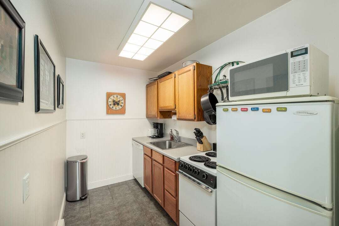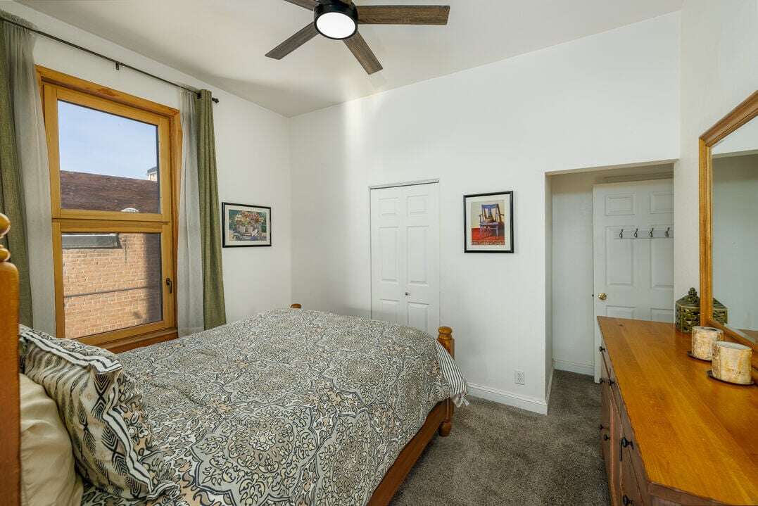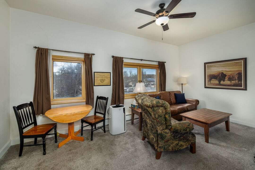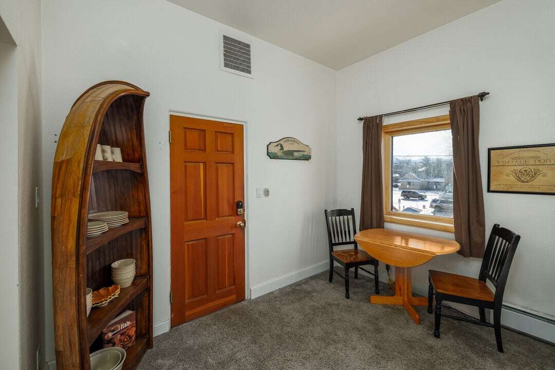 The living space is warm and inviting, featuring a leather sofa, an oversized western-themed recliner, and a hand-hewn oak entertainment center with a TV. Board games and a library of music make relaxing inside just as enjoyable as exploring downtown. The dining area seats four around a round drop-leaf oak table. The bedroom offers an oversized queen oak bed, with a pillow-top mattress, ample storage with a dresser, mirror, and walk-in closet. The bright bathroom features a tub.shower combo and retro built-in cupboards just outside the bathroom.
