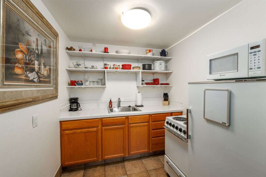 The living area features modern furnishings, a mirrored wine glass rack for entertaining, and a pub style dining table with two stools. An entertainment center includes a TV with cable, DVD player, stereo system, and a curated library of movies and music. Through a charming retro arched opening to the fully equipped kitchen is stocked with all the essentials, along with colorful glassware and dishes that match the apartments playful style. The bedroom is a serene escape, complete with a king-size bed a spacious closet and touches of Montana charm. The bathroom includes a tub/shower combo with built-in cabinets and laundry facilities located down the hall.