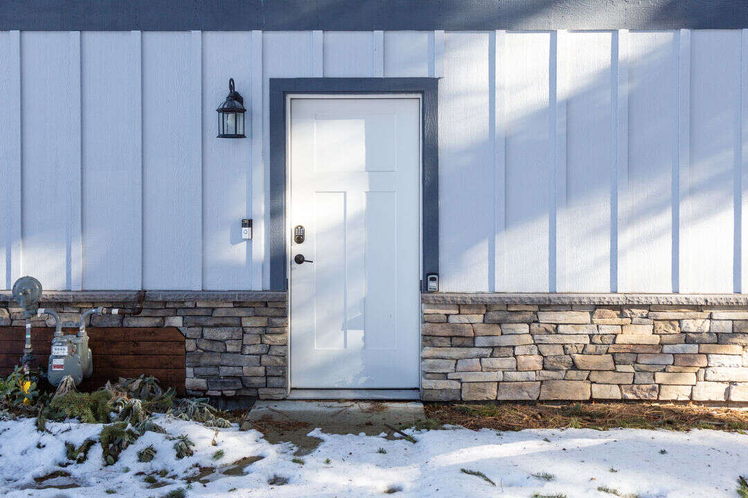 When you arrive, you’ll find parking available in the driveway or the attached two-car garage. A private walkway leads you to the side entrance of the home. Inside, there's a small entry area where you can hang up coats and kick off your shoes. The first level features a guest bedroom with a king-size bed and a full bathroom with a shower/tub combo—great for guests who prefer to avoid stairs.