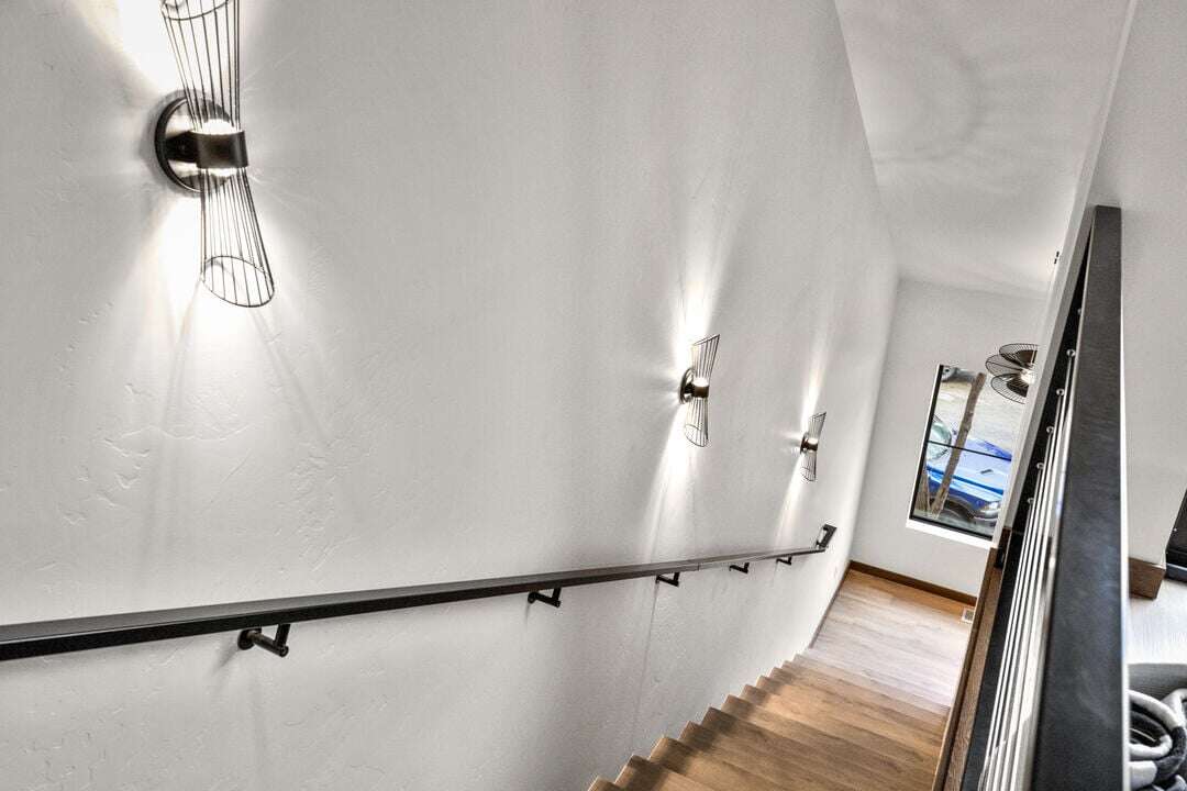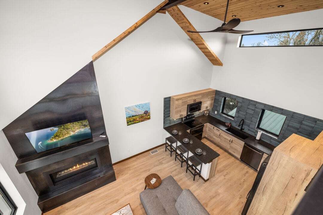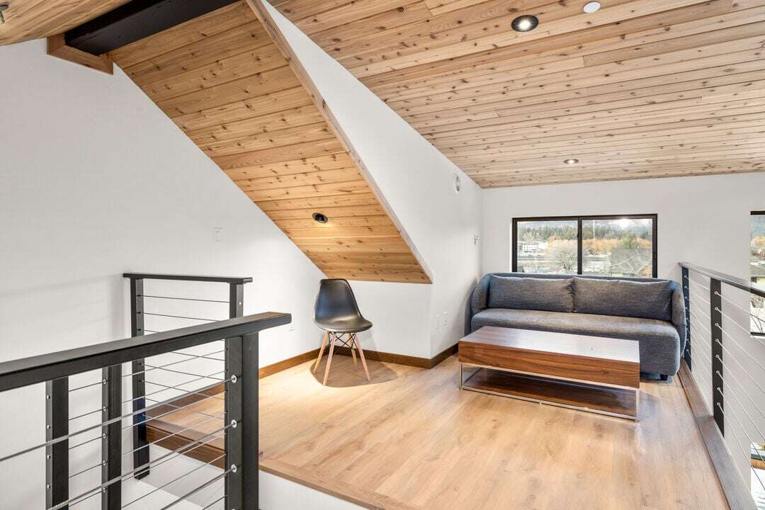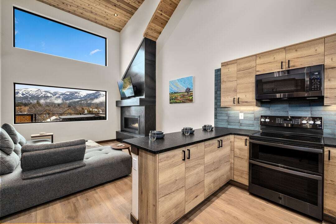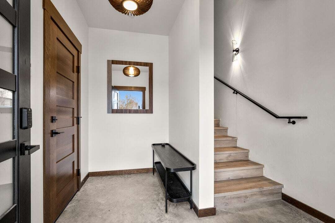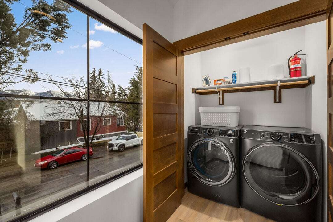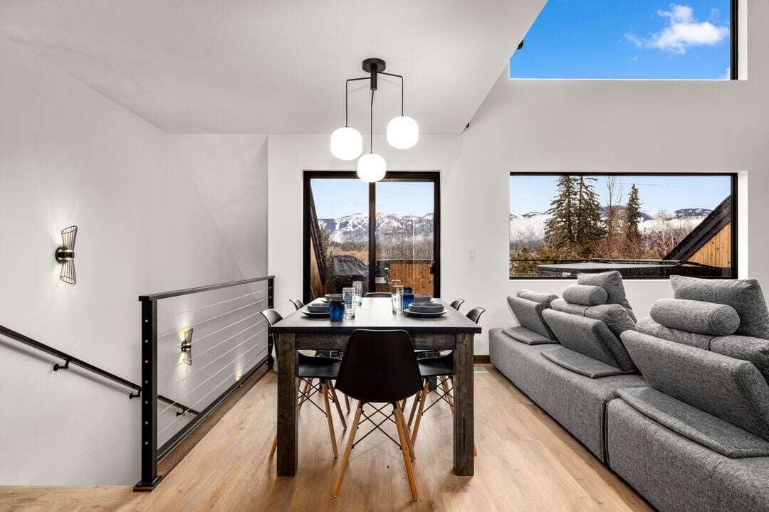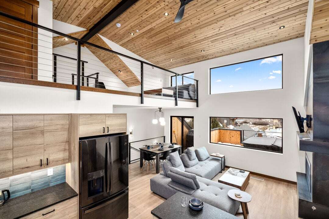 Cloud Nine Central is one of three luxury condos at the Cloud Nine building. This luxury home is spread over three levels plus a bonus lofted bedroom over the main living area. The entry level provides access to the private garage with EV charger, parking for one vehicle, and plenty of storage space for your outdoor gear. An additional off-street parking space is available in the home’s driveway. Take the stairs from the entryway up to floor two of the home.