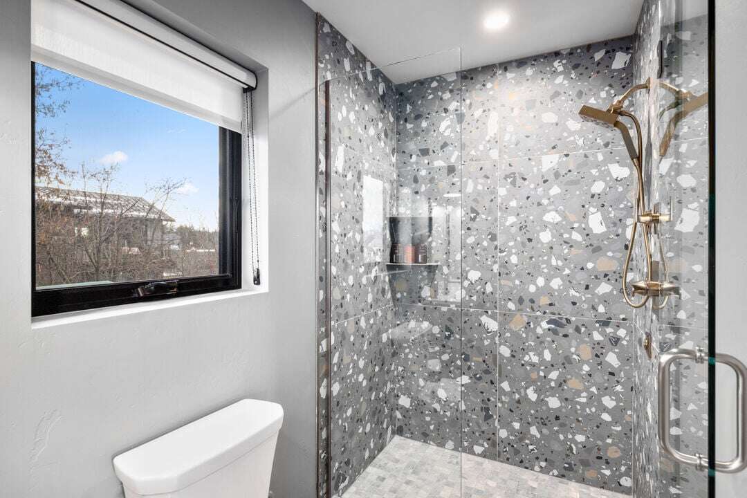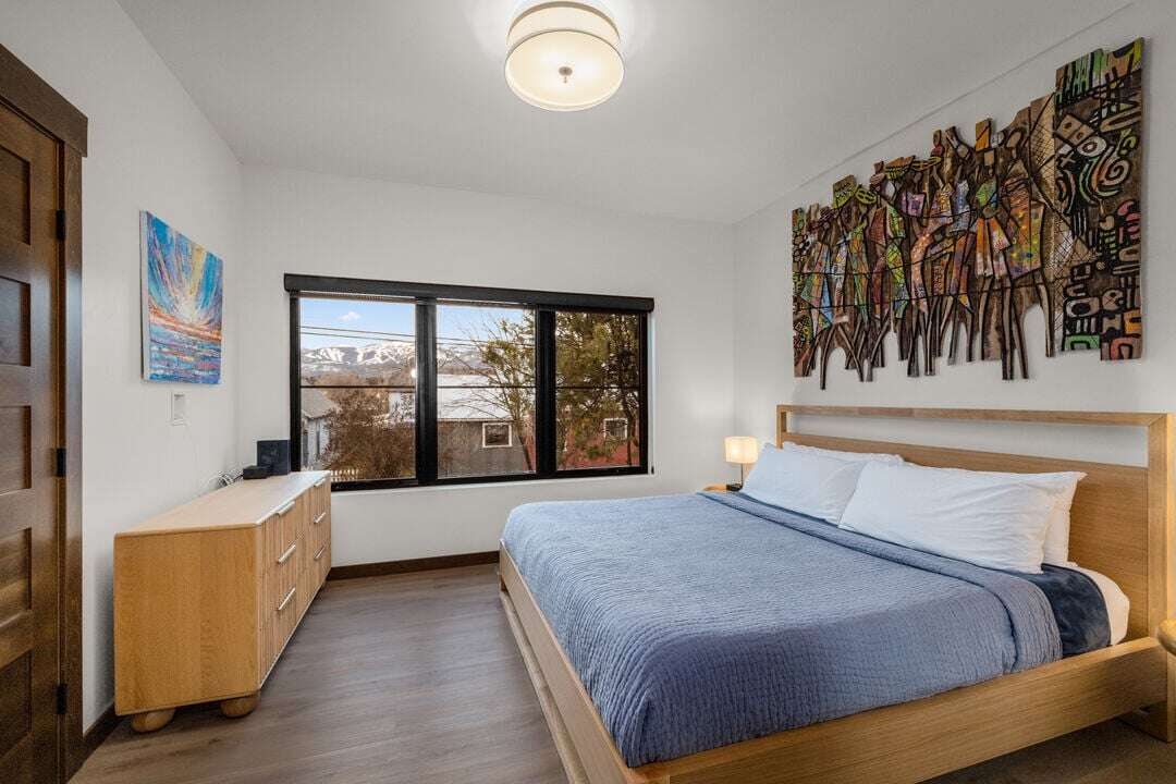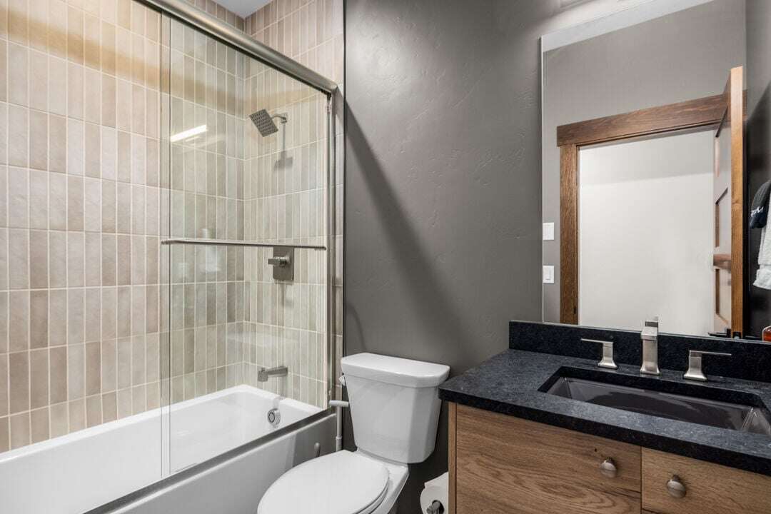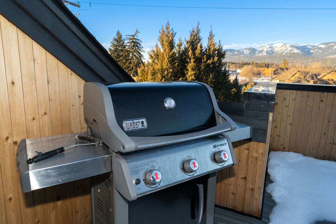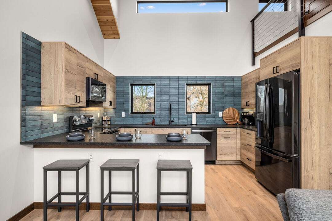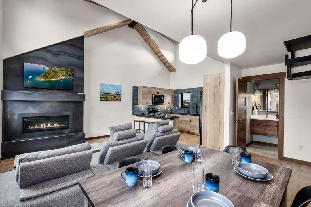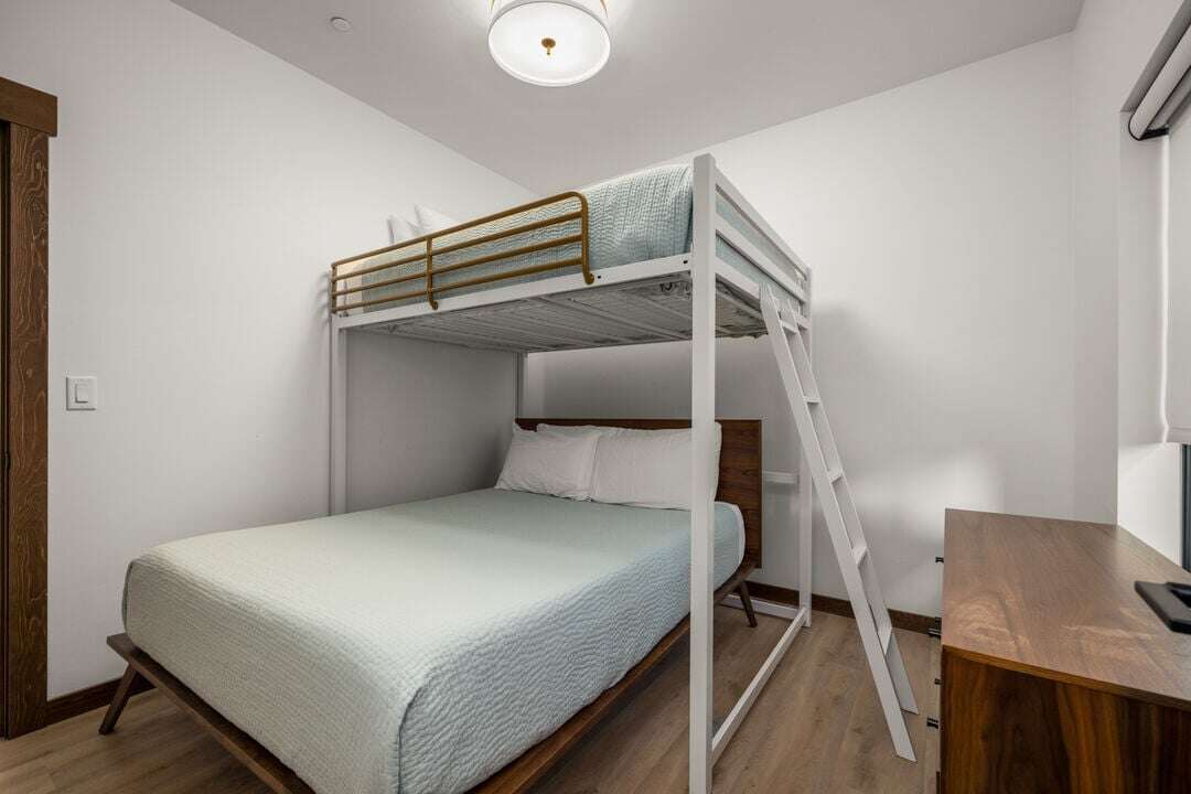 Floor three boasts the main living space of the home. The open concept floor plan provides plenty of space for the whole group to reconnect after a day of adventure. The kitchen, featuring stunning blue tile and black granite countertops, is fully equipped with everything needed to create memorable meals. The high-end kitchen appliances are a chef’s dream! The kitchen also features a breakfast bar with seating for 3 guests. The dining area is adjacent to the kitchen, featuring a beautiful modern table and seating for up to 8 guests. The center point of the living room is the stunning gas fireplace framed by custom metalwork. Relax on the oversized sectional sofa and enjoy a movie night on the home’s smart television. There is a full bathroom with a custom tile shower that serves the main living area and lofted bedroom. Follow the spiral staircase to bedroom 4, the loft. Offering a full-size sofa sleeper, the loft is a fun bonus space to accommodate additional guests or have a separate living space for younger guests. The main living space is illuminated by the expansive windows and sliding door that leads out to the home’s private patio. The patio offers a private hot tub, grill, seating, and breathtaking views of Big Mountain.