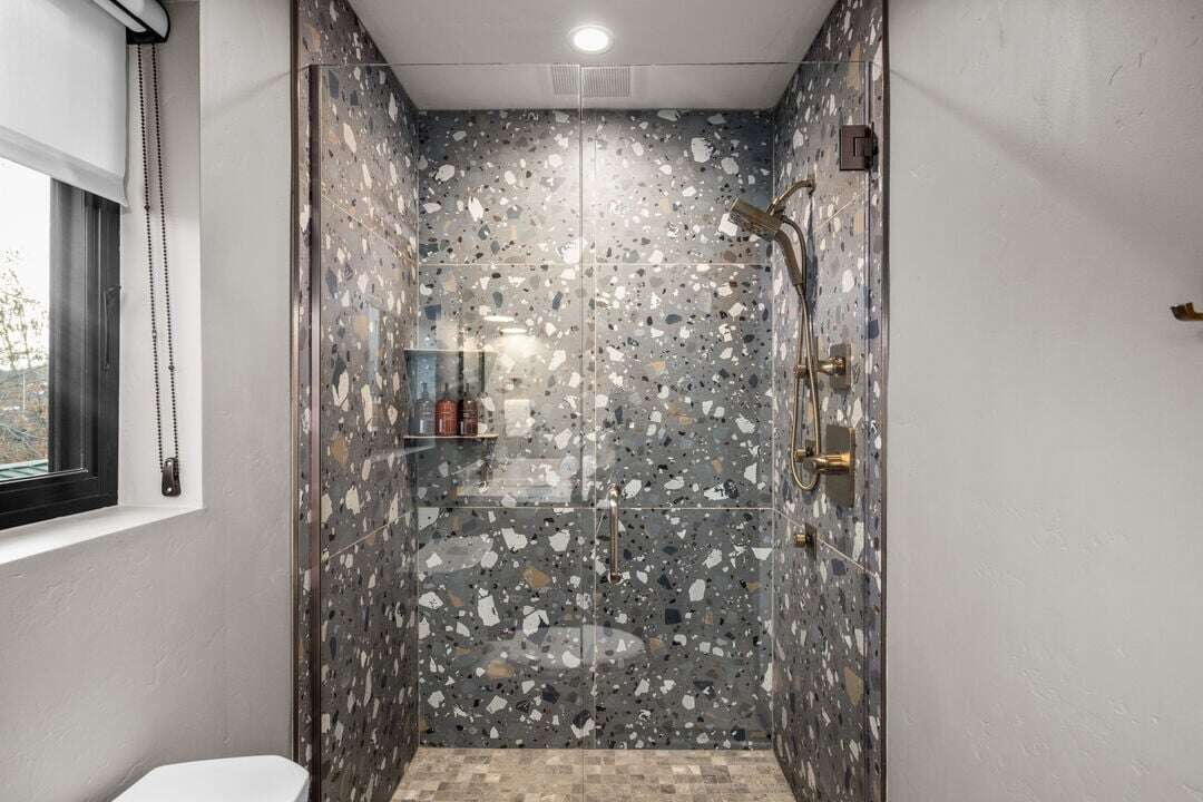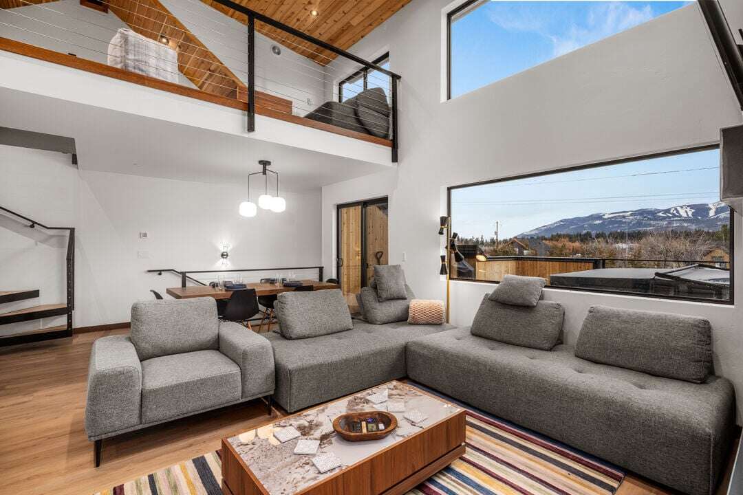 Floor three boasts the main living space of the home. The open concept floor plan provides plenty of space for the whole group to reconnect after a day of adventure. The kitchen, featuring stunning blue tile and black granite countertops, is fully equipped with everything needed to create memorable meals. The high-end kitchen appliances are a chef’s dream! The kitchen also features a breakfast bar with seating for 4 guests. The dining area is adjacent to the kitchen, featuring a beautiful modern table and seating for up to 8 guests. The center point of the living room is the stunning gas fireplace framed by custom metalwork. Relax on the oversized sectional sofa and enjoy a movie night on the home’s smart television. There is a full bathroom with a custom tile shower that serves the main living area and lofted bedroom. Follow the spiral staircase to bedroom 4, the loft. Offering a queen-size sofa sleeper, the loft is a fun bonus space to accommodate additional guests or have a separate living space for younger guests. The main living space is illuminated by the expansive windows and sliding door that leads out to the home’s private patio. The patio offers a private hot tub, grill, seating, and breathtaking views of Big Mountain.