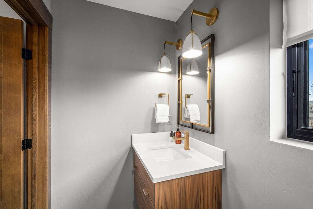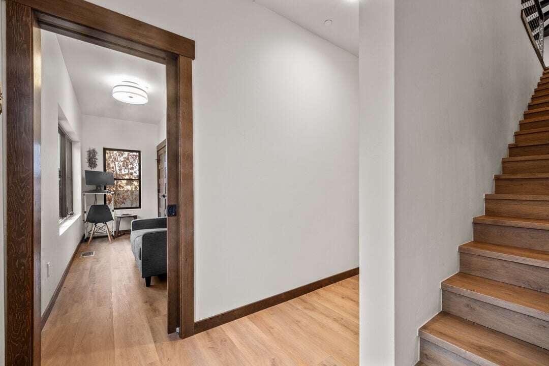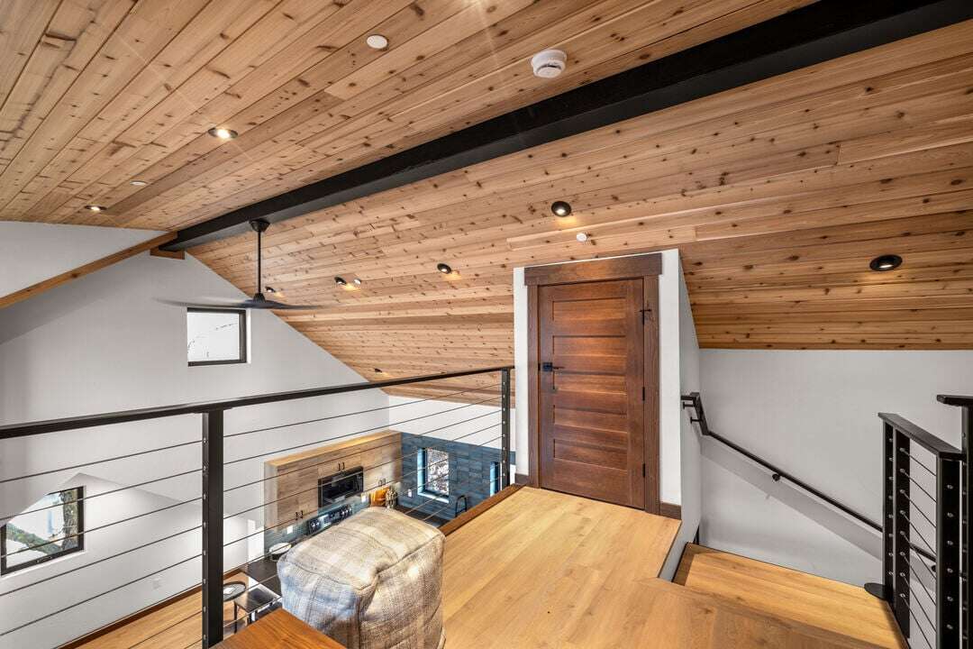 Cloud Nine East is one of three luxury condos at the Cloud Nine building. This luxury home is spread over three levels plus a bonus lofted bedroom over the main living area. The entry level provides access to the private garage with EV charger, parking for one vehicle, and plenty of storage space for your outdoor gear. An additional off-street parking space is available in the home’s driveway. Take the stairs from the entryway up to floor two of the home.