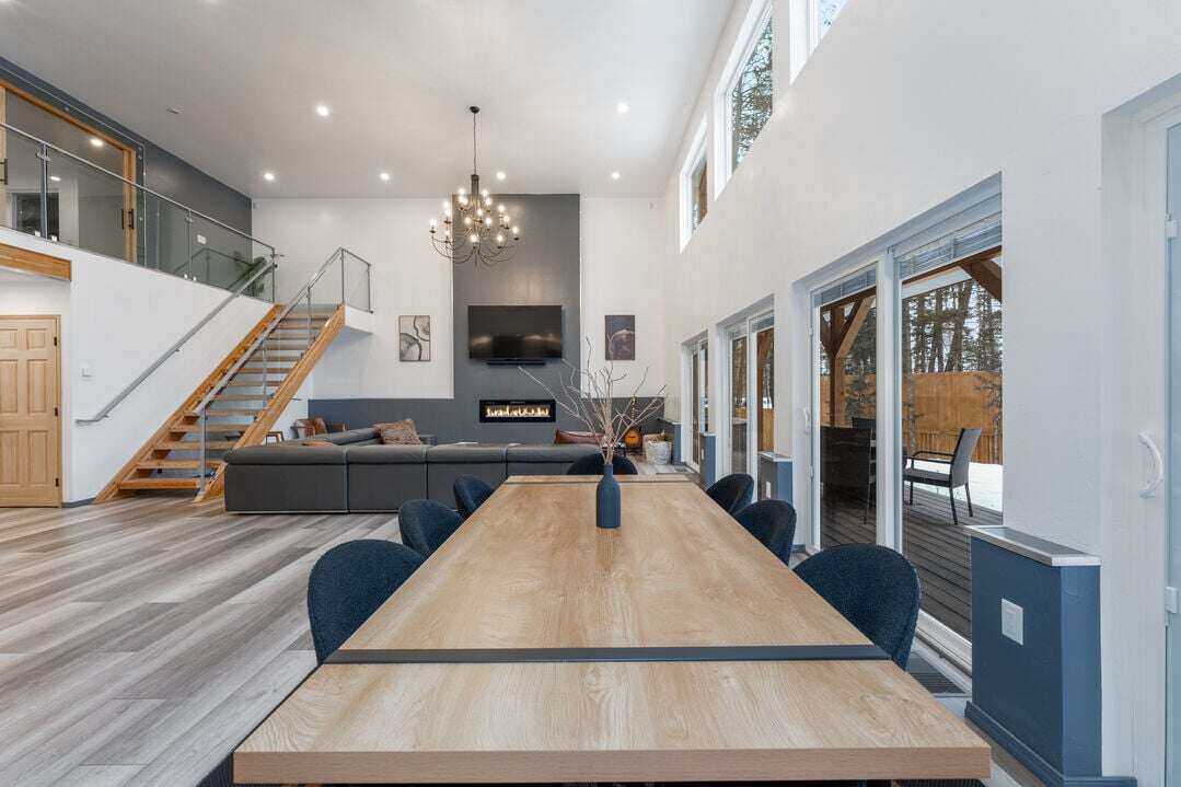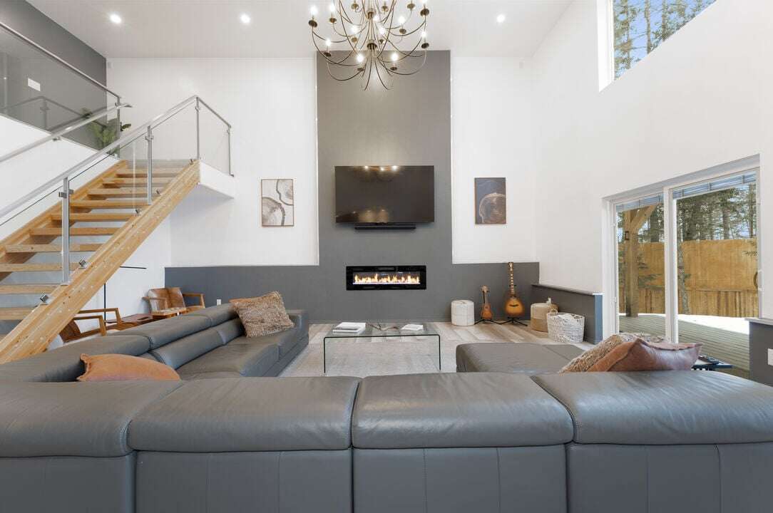 As you step inside, you'll be immediately struck by the vast, open-concept living space, bathed in natural light. One side of the home boasts floor-to-ceiling windows, offering views of the surrounding woods and flooding the home with sunshine. The modern design showcases clean lines, high-end finishes, and plenty of space to relax.