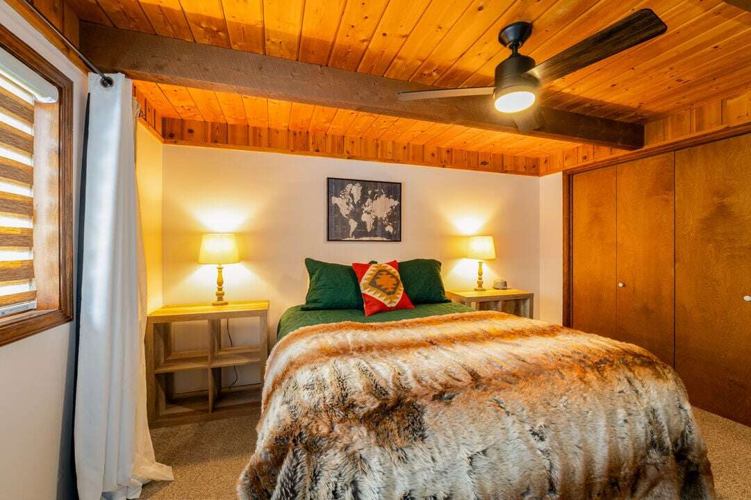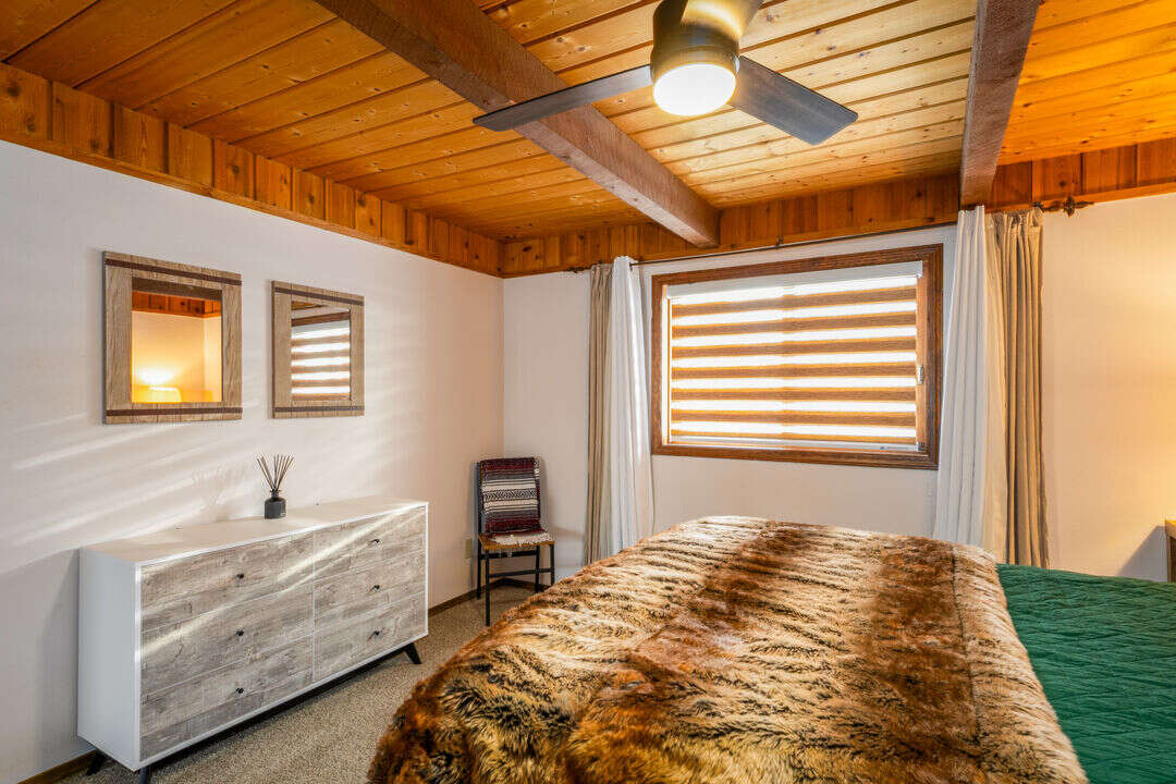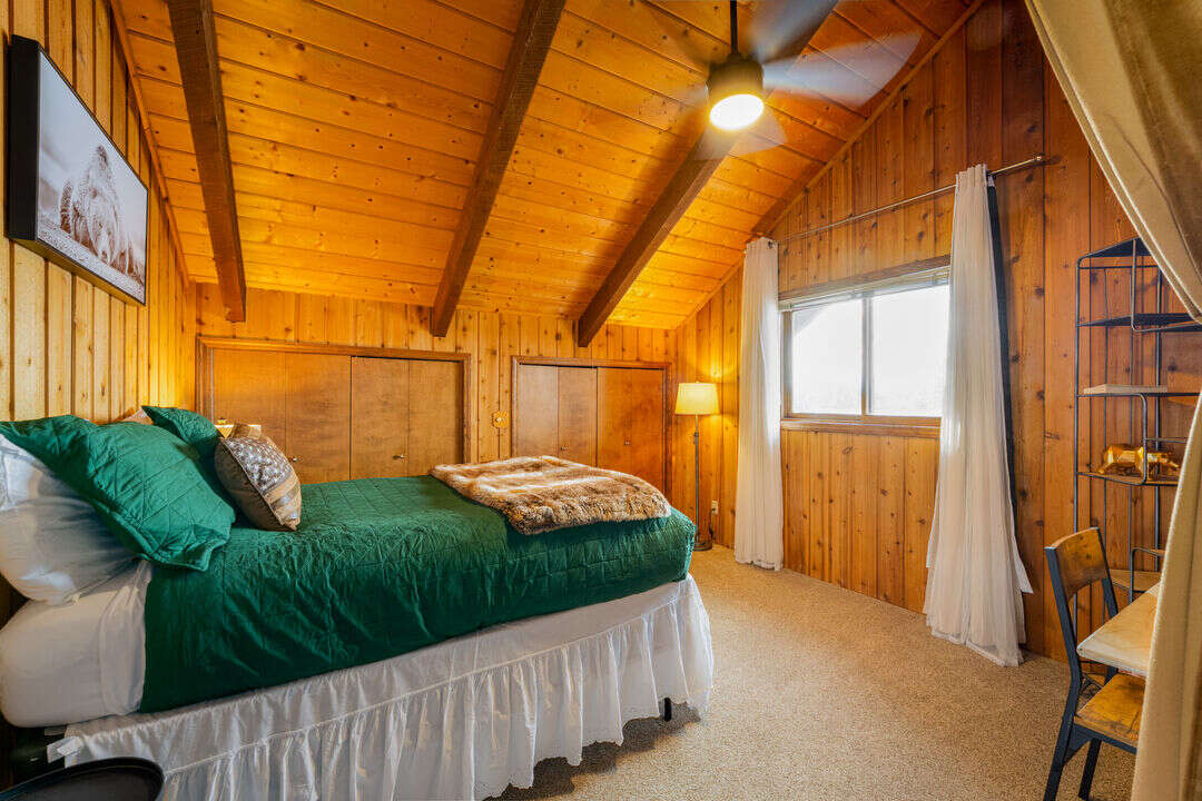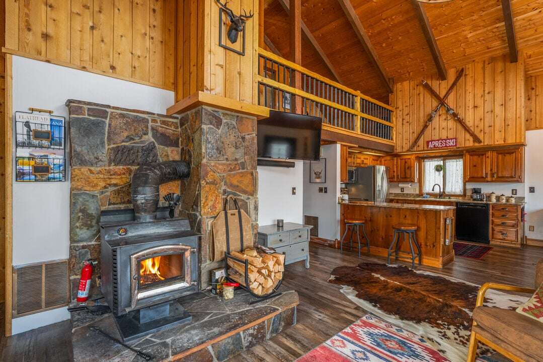 The property exudes a cozy mountain cabin vibe, spanning 1,152 square feet across two levels. It includes two bedrooms and two bathrooms, comfortably accommodating up to four guests. Upon arrival, guests are greeted by a charming main front porch, leading into an open-concept main floor. This space features high ceilings, ample natural light from numerous windows framing picturesque mountain views, and a loft that overlooks the living area. Curl up in the inviting living room, which is furnished with a comfortable leather sofa, a Smart TV, and a warm, wood-burning stove—perfect for chilly evenings. The kitchen comes fully equipped with all appliances, including an electric range and a refrigerator. It is well-stocked with everything needed to prepare delicious home-cooked meals. Guests can enjoy their culinary creations at the chic kitchen island with seating for three or at the adjacent dining table, which seats four comfortably.