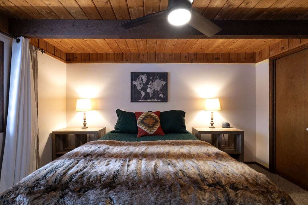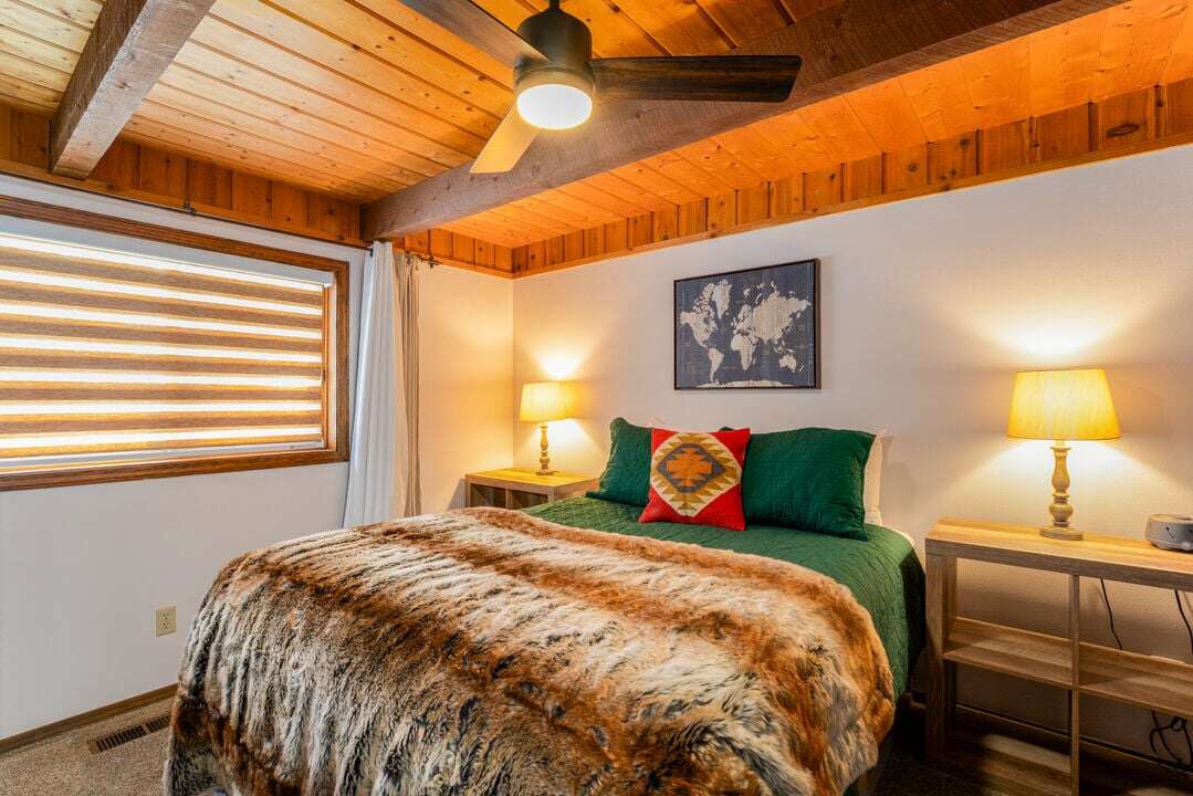 The primary bedroom located on the main level features a queen-size bed. The second bedroom is located in the loft and has a queen-size bed. The main-level full shared bath features a tub/shower combo. The upper-level full shared bath features a shower.