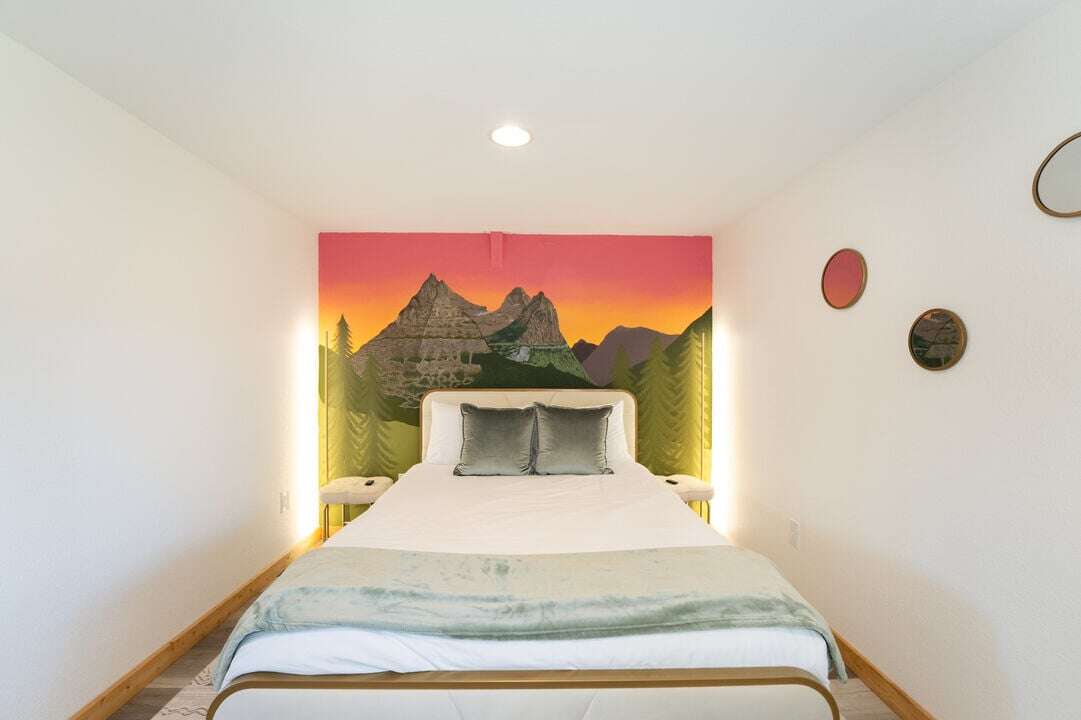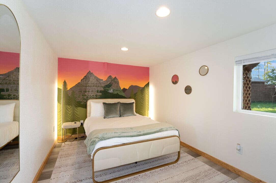 Behind the house is an ADU where you will find two more bedrooms, a bathroom. Inside, there are two additional bedrooms with both featuring queen-size beds and beautifully painted murals. There is a shared bathroom with a large standing shower. You'll also find a game room where you can enjoy a large sectional and Smart TV, mini-fridge, plus a shuffleboard table and foosball table. A great space for some indoor fun.