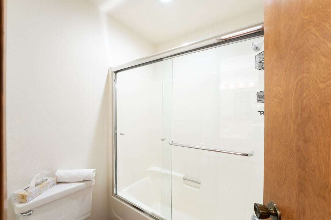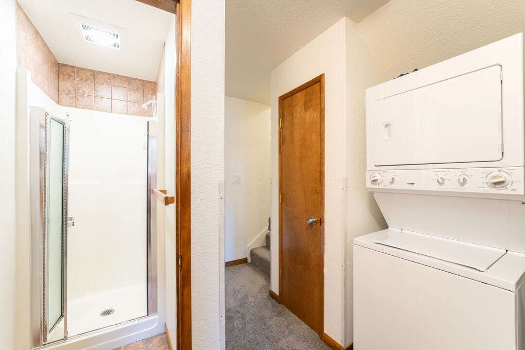 Next, head on down to the lower level where there are two bedrooms and a shared full bathroom. The first bedroom features a king-size bed. The second bedroom is split in half with built-in twin bunk beds and a queen-size bed. This level also has access to laundry machines.