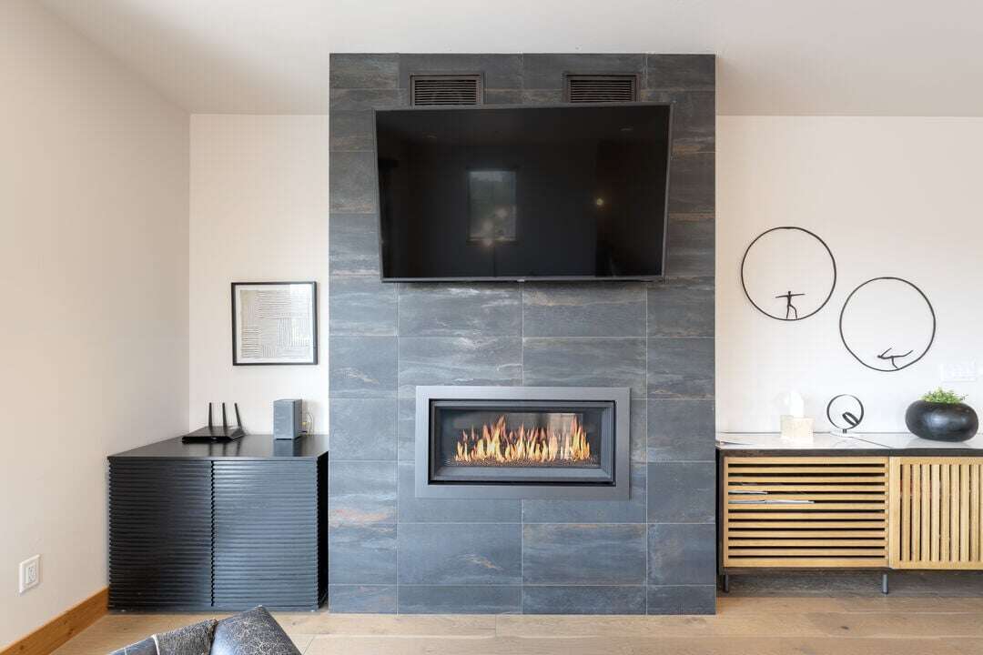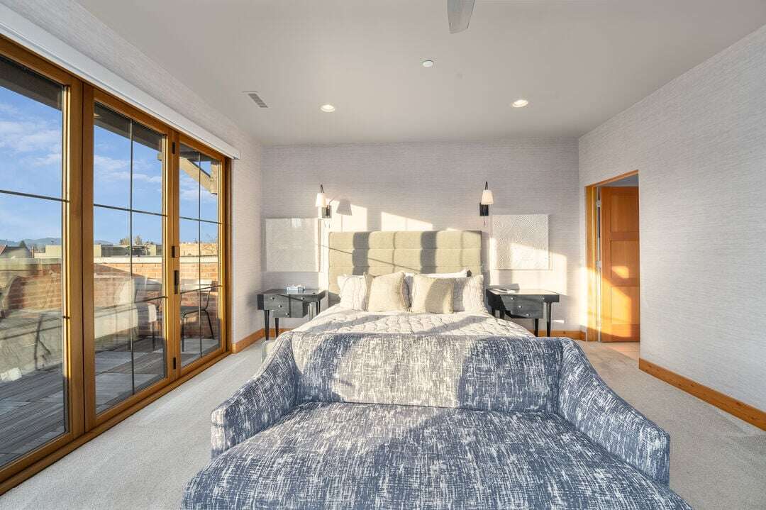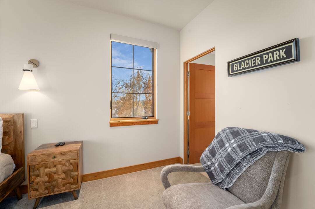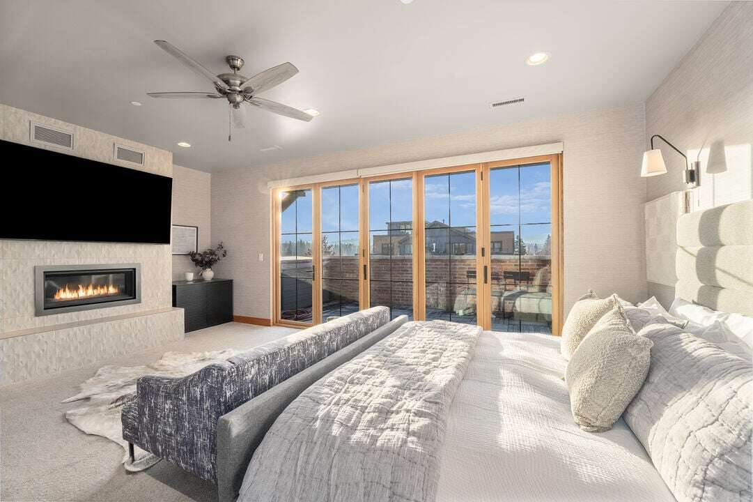 The open-concept kitchen, dining, and living area is bright and spacious, featuring floor-to-ceiling windows, a cozy fireplace, and contemporary furnishings with subtle industrial touches. The primary bedroom offers a comfortable space to relax after a day of exploring Montana. With floor-to-ceiling windows, a private fireplace, and a king-size bed, this is a great spot to unwind. The other two bedrooms offer comfortable queen-size beds with ensuite bathrooms and deck access.