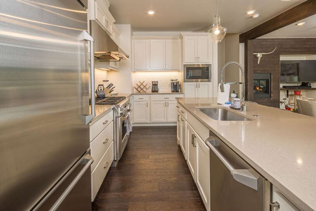 Inside you'll find a cozy living space with an open concept great room that features rich hardwood floor, and large picture windows that frame the surrounding scenery. The sleek fireplace placed in a wood accent wall provides a wonderful place to gather after a day of hiking, biking, skiing, or even shopping.