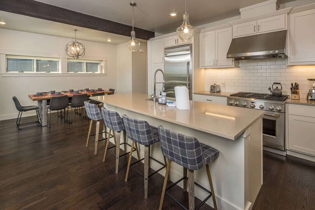 The fully equipped kitchen is finished with all stainless steel appliances. The ample counter space provides the perfect place to share your stories of the day while preparing family dinner. The large center island, including four seats, and an adjacent dining room table for eight more, allows for the whole family to keep the laughter and conversation going.