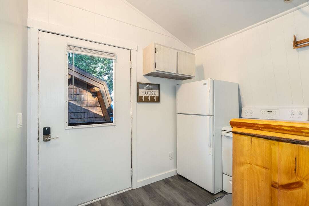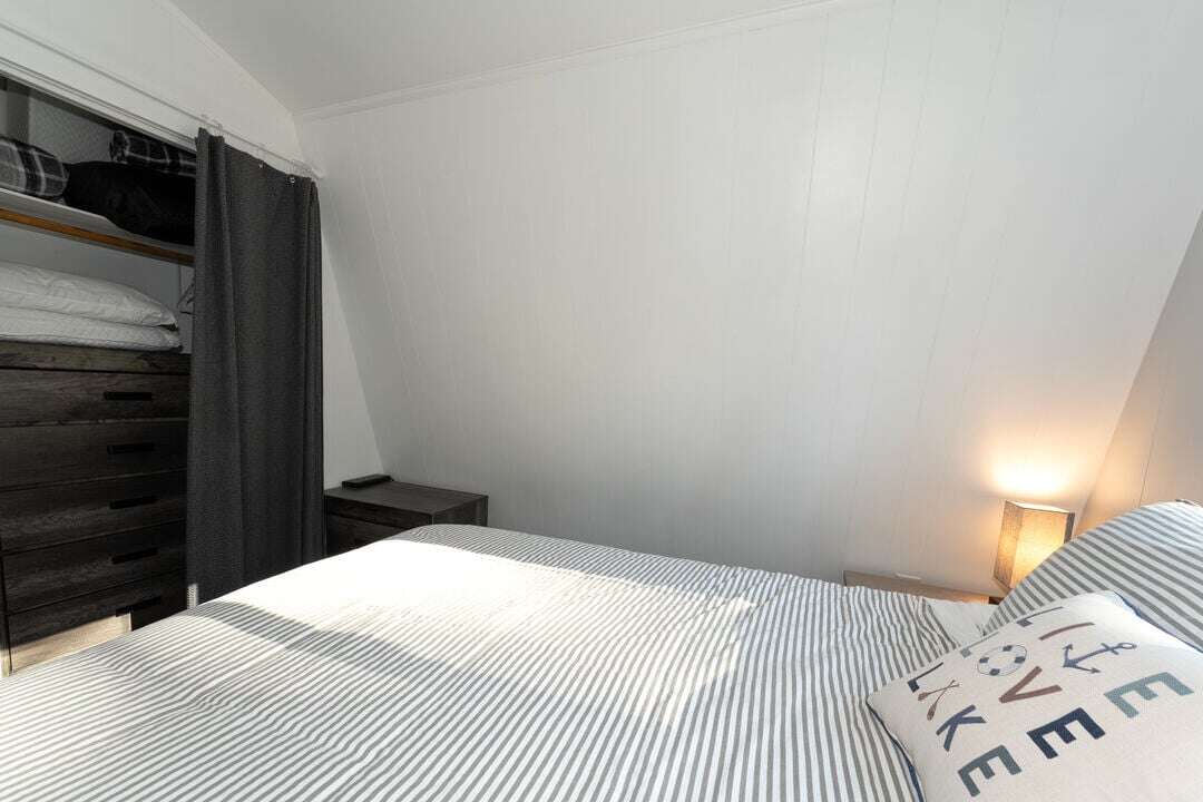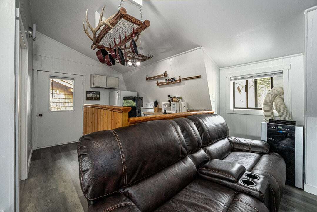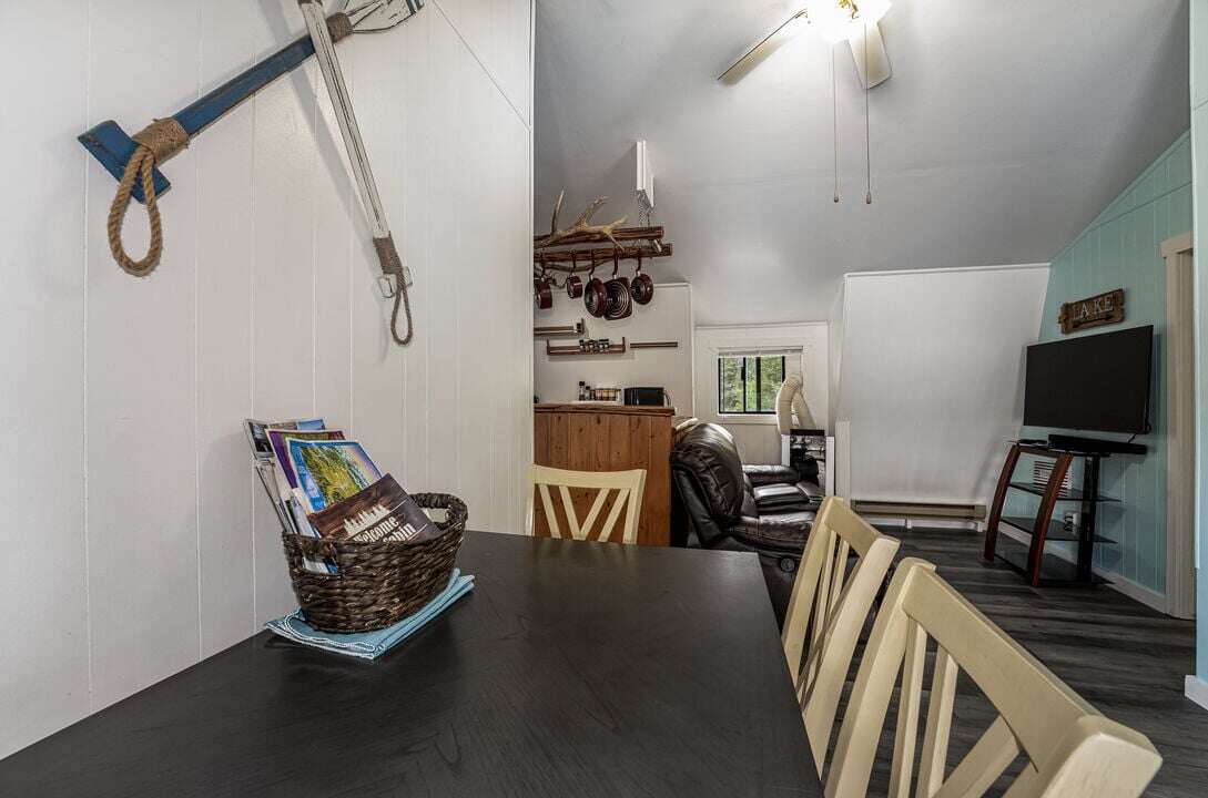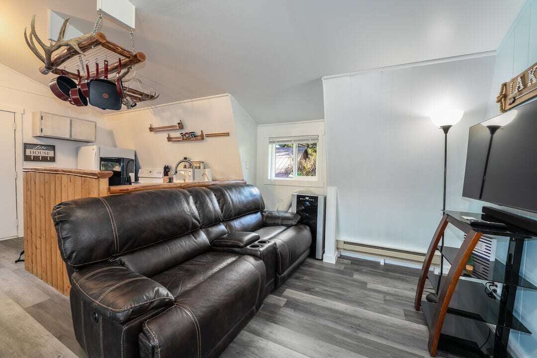 This cozy two-bedroom home brings all the charm and comforts of home. The fully equipped kitchen is designed with simplicity in mind. The clever details like open shelving, an antler chandelier, and overhead pot racks create a welcoming lodge feel. Opening up passed the kitchen is a comfortable living area where a large sliding door opens to a balcony overlooking the lake.