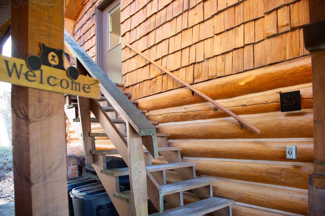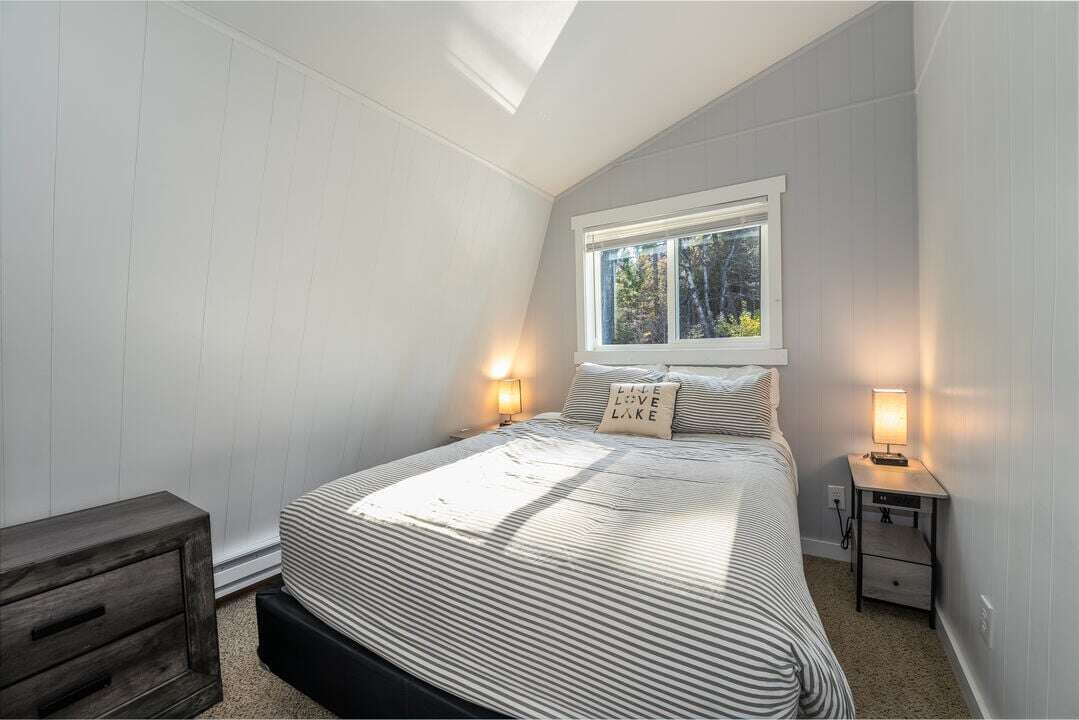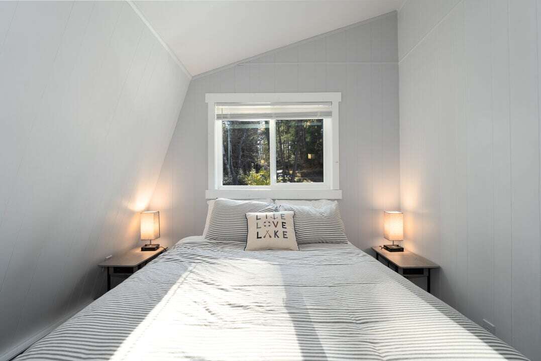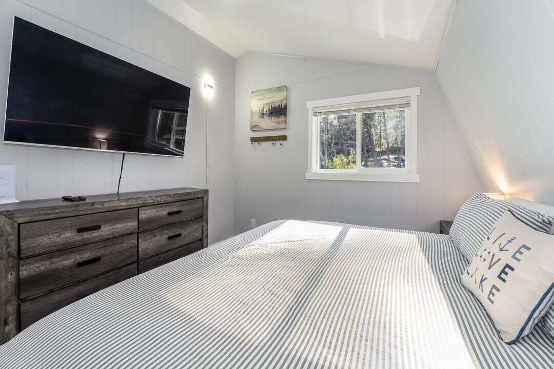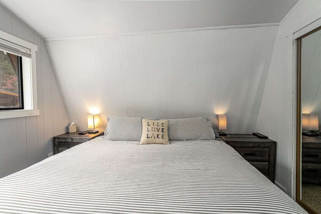 This cozy two-bedroom home brings all the charm and comforts of home. The fully equipped kitchen is designed with simplicity in mind. The clever details like open shelving, an antler chandelier, and overhead pot racks create a welcoming lodge feel. Opening up passed the kitchen is a comfortable living area where a large sliding door opens to a balcony overlooking the lake.