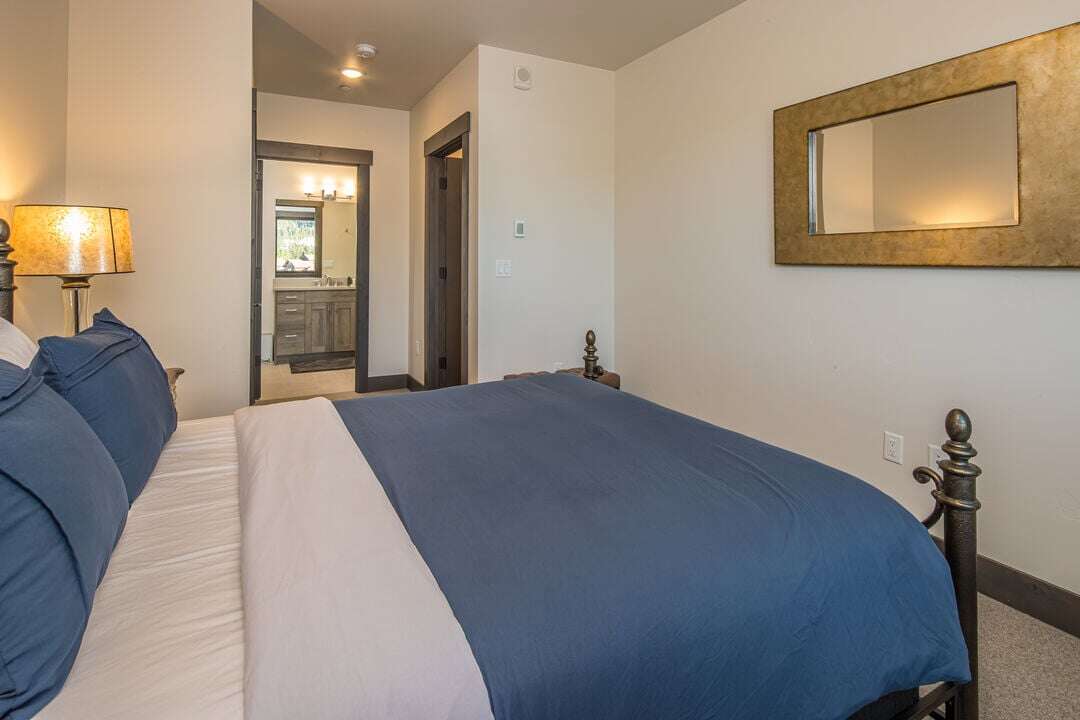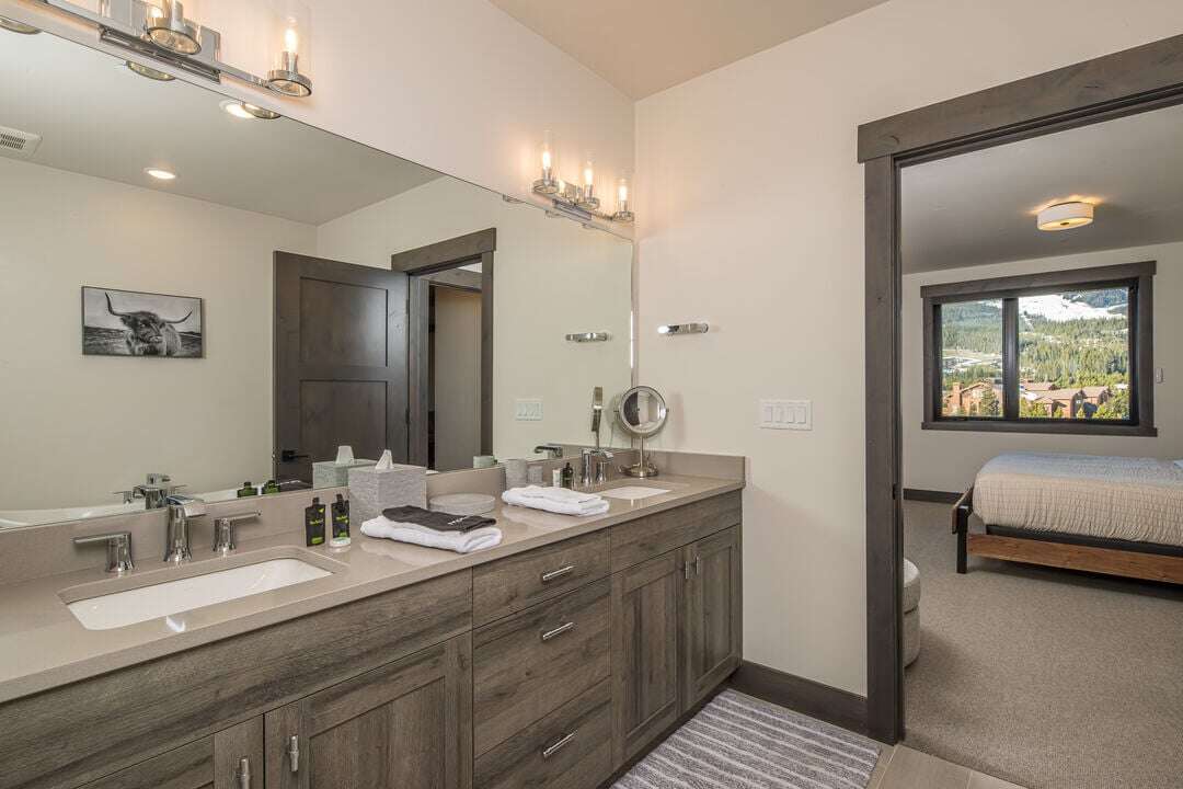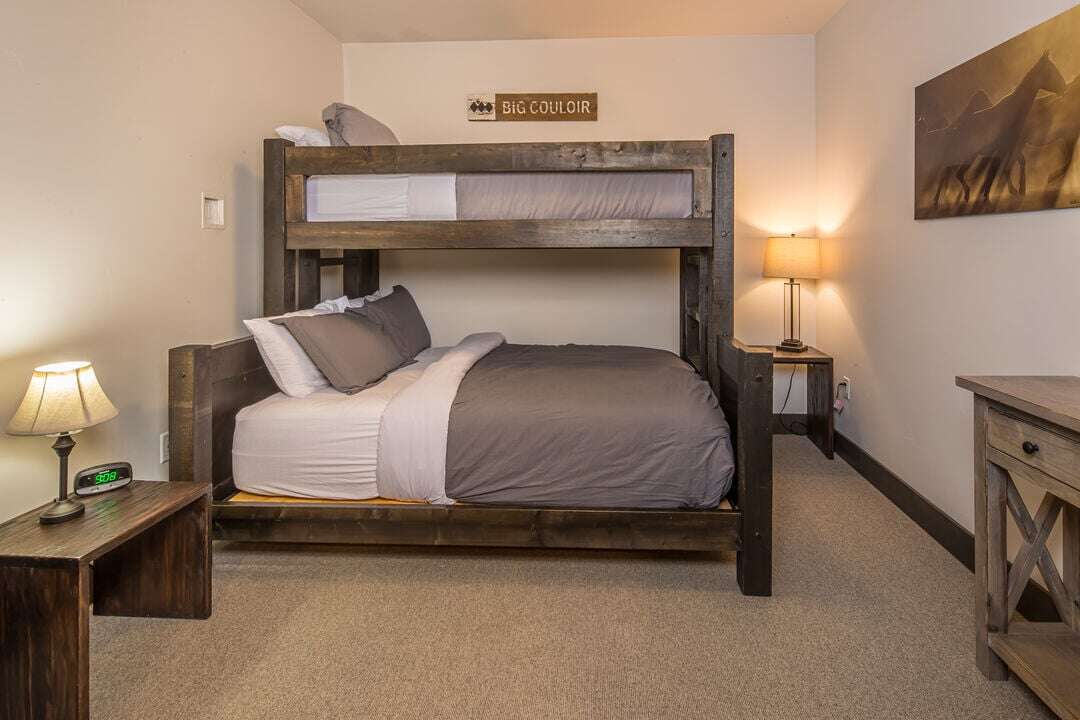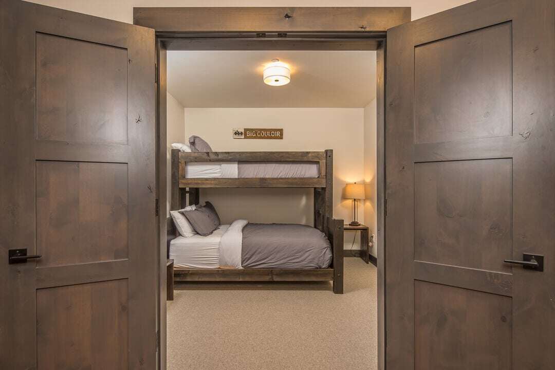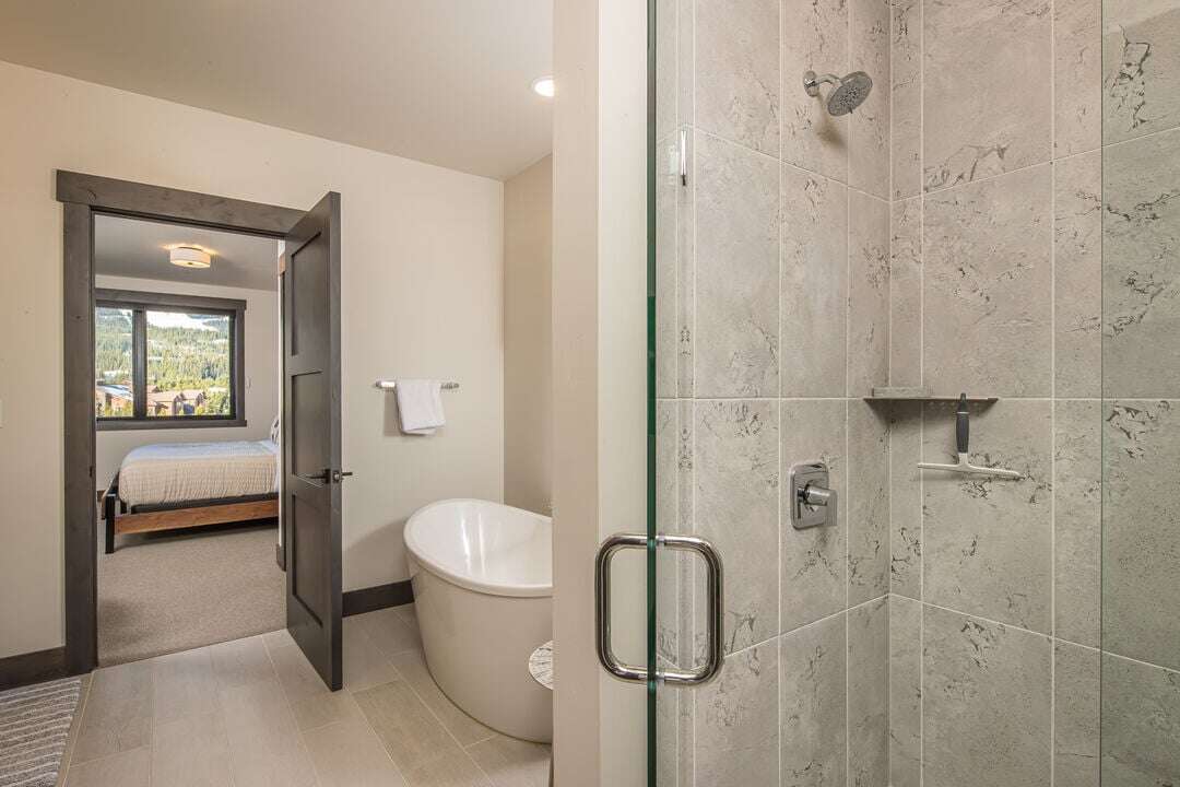 Each bedroom provides comfort and privacy, thoughtfully designed for a relaxing stay. The primary bedroom and second bedroom both have an ensuite bathroom and spacious closets. The bunkroom features a full-over-queen bunk, perfect for kids. The primary ensuite features a soaking tub and a glass walk-in shower. The two other bathrooms also have beautiful walk-in showers. After a day full of exploring Big Sky's trails, slopes, or shops, recharge in your own private retreat.