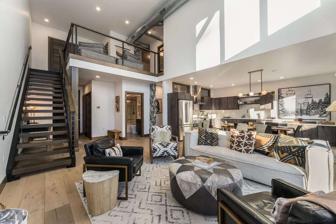 As you enter the condo on the 2nd floor, you will be welcomed into the open concept living area and kitchen. This open concept makes this space perfect for getting together with friends and family while making dinner, watching your favorite movie, or playing games. Warm up by the fireplace and relax while taking in the Montana sky through the large windows that bring in the warm natural light. Enjoy your full kitchen that has everything you need to make your favorite meal. Open the glass doors, and you will be greeted by your own private balcony that includes seating for your group around the fire pit, or access to your private hot tub.