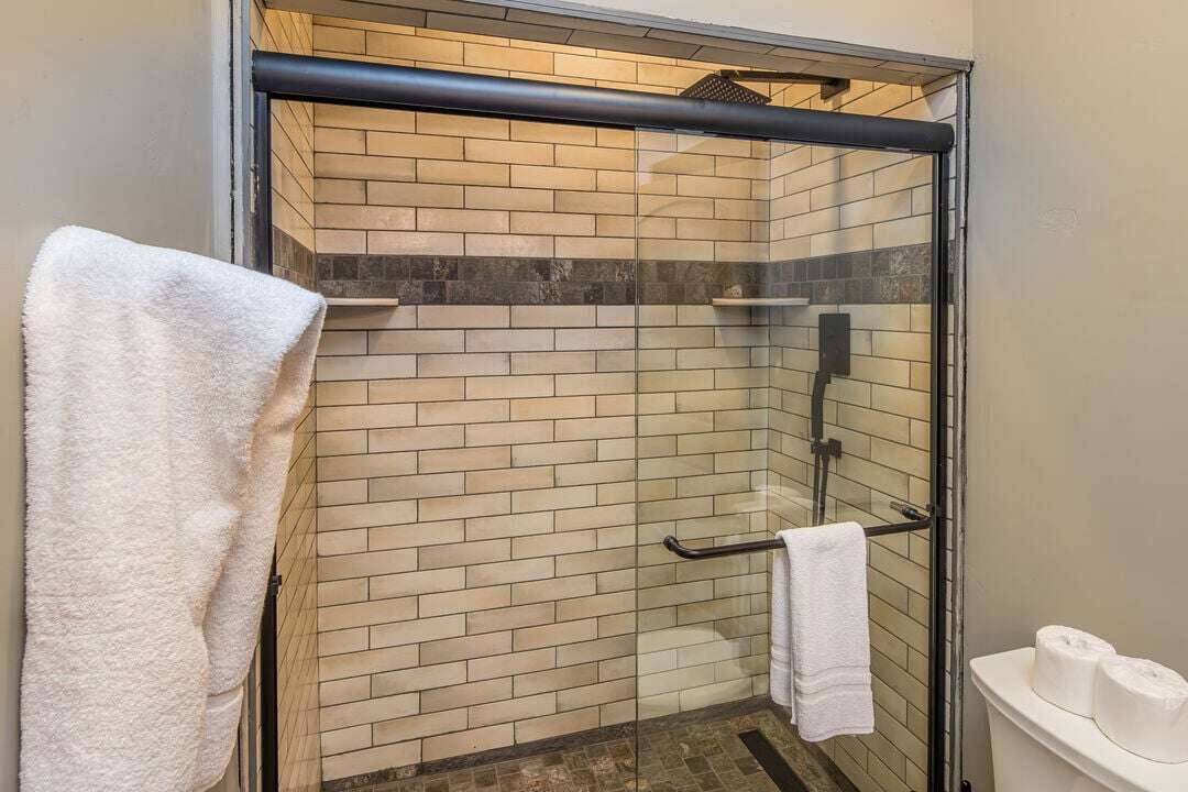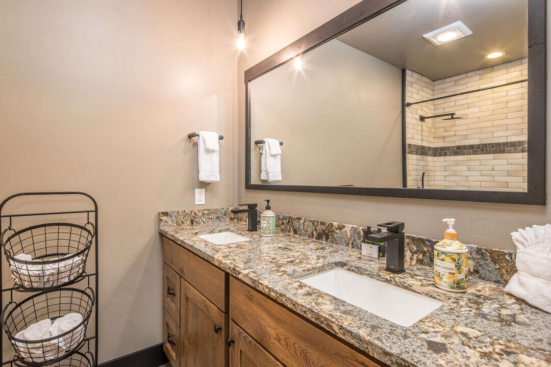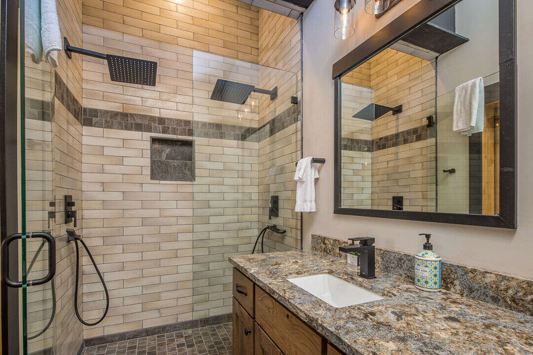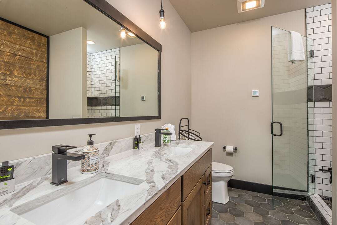 Bathroom 1: Double Vanity | Standing Shower | Toilet | Main Level