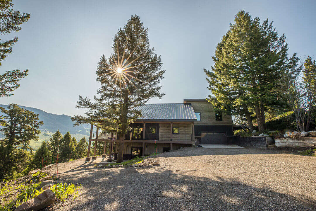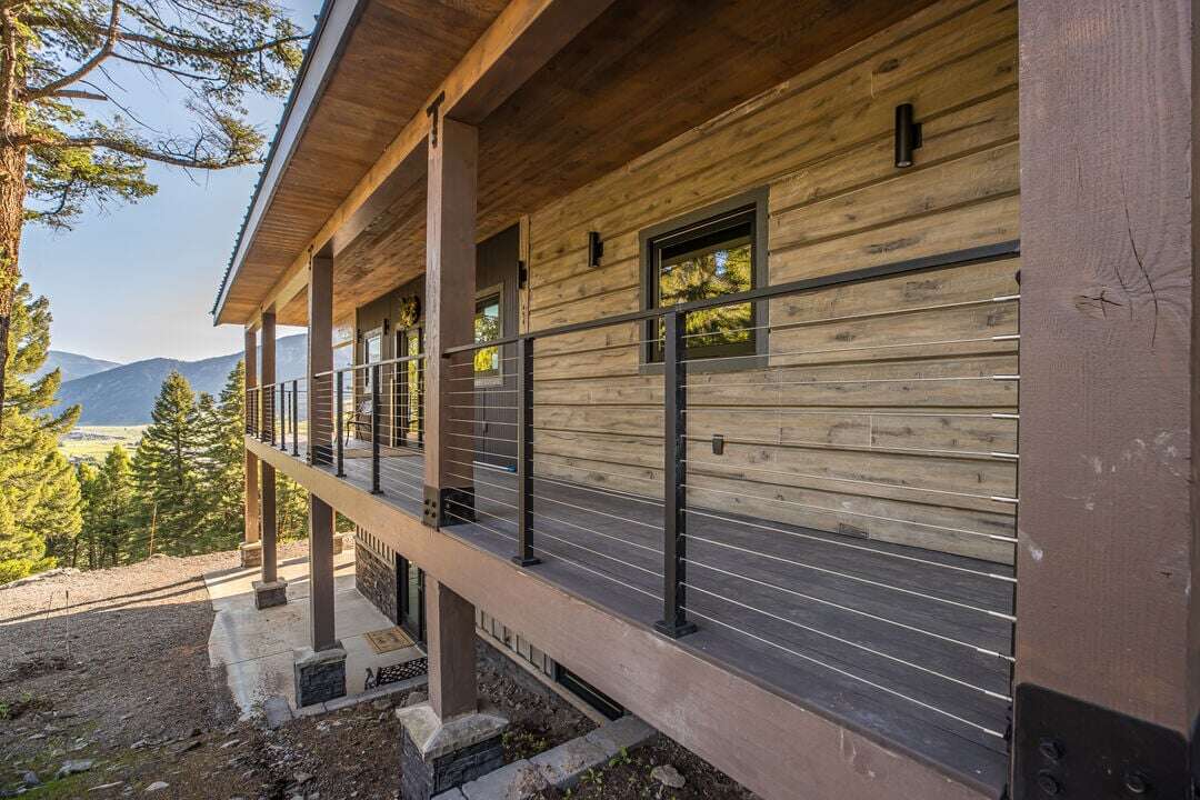 The exterior of the home showcases a seamless integration of rustic and contemporary elements. The outer façade features wood siding, metal roof, and large panoramic windows that provide unobstructed vistas of the majestic mountain range. A spacious wrap-around deck on the upper level allows residents to bask in the breathtaking scenery and connect with nature.