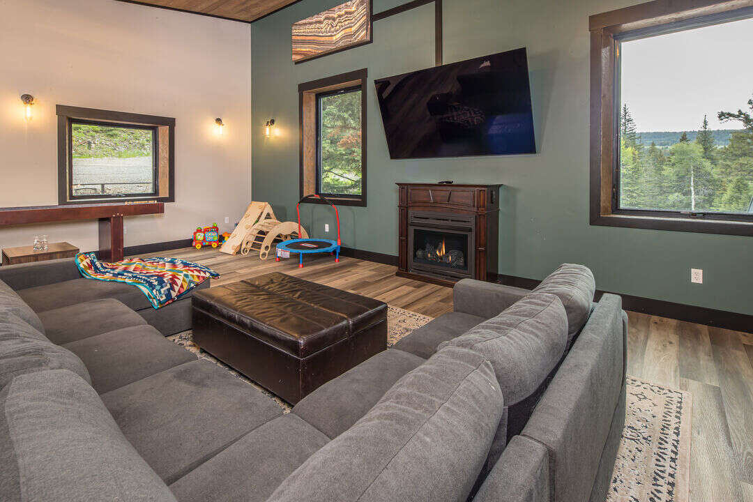 Ascending the staircase, you'll find the second level, which is dedicated to recreation and rejuvenation and features an expansive family room with oversized windows that provide unparalleled forrest views. This living area serves as a central hub for relaxation and entertainment, complete with a home theater system and plush seating. On this level, a beautifully designed stone lights, a shuffleboard table and plenty of toys for the kids!