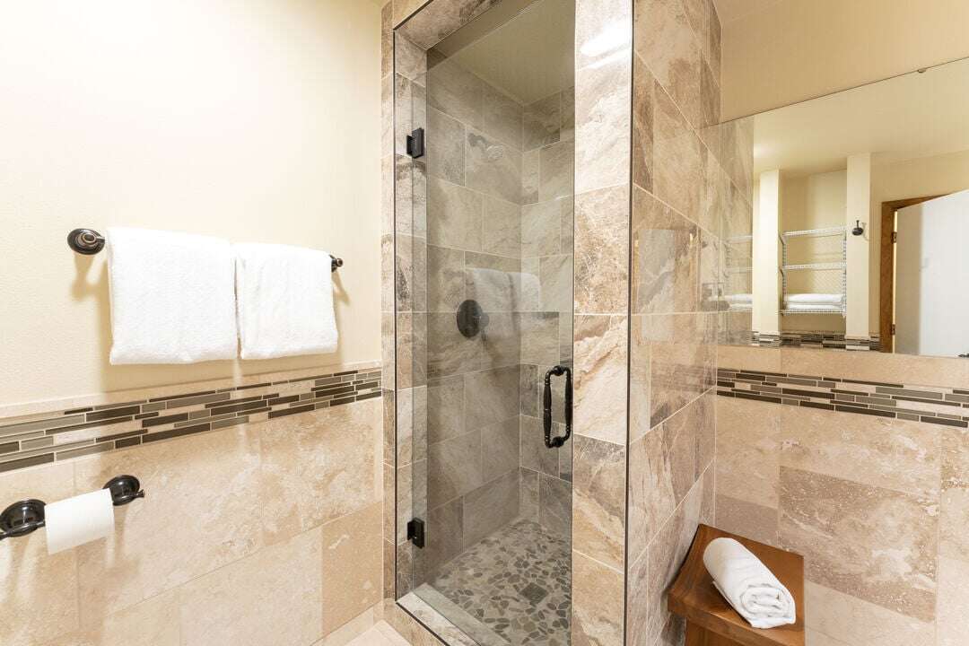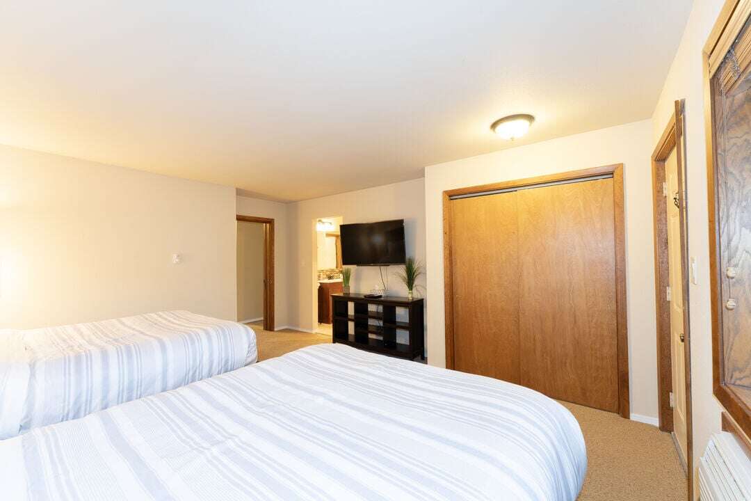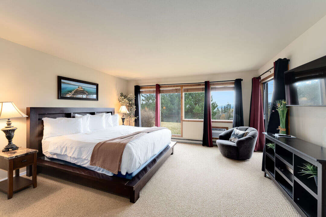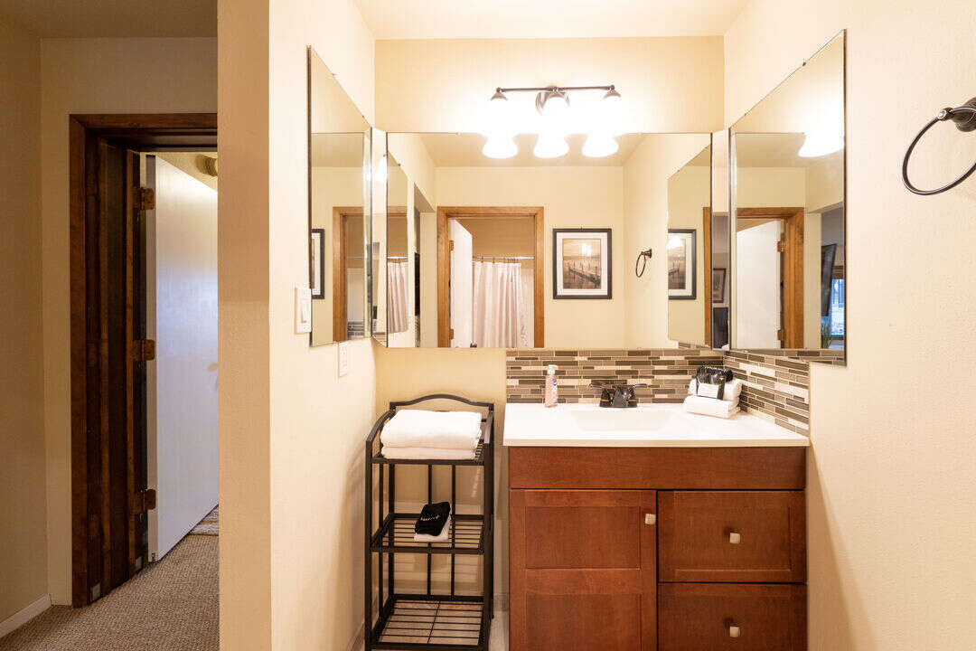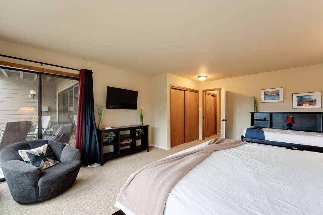 The spacious primary bedroom features a king and twin size bed, with floor to ceiling windows that flood the room with natural light, and a private slider that opens directly to the patio. The bathroom includes a dual vanity with excellent lighting making it easy to get ready before heading into downtown Bigfork for dining or shopping. The second bedroom offers two queen beds - great for kids or additional guests - and its own private ensuite bath, giving everyone space and privacy to unwind.