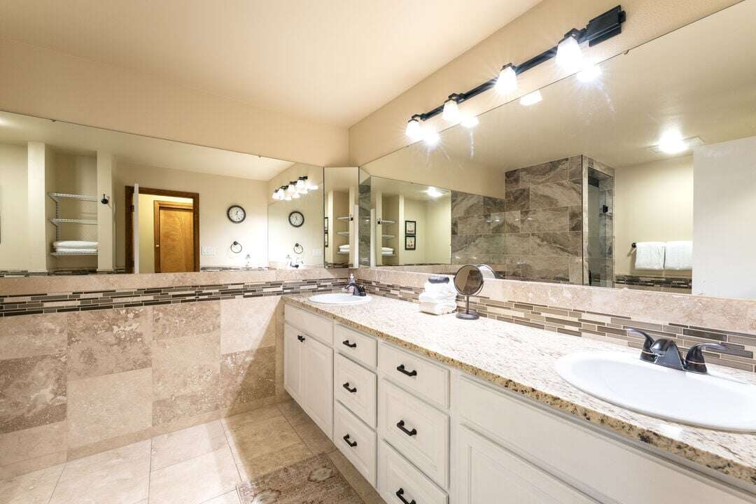 Bathroom 1: Dual Vanity | Standing Shower | Toilet | Main Level