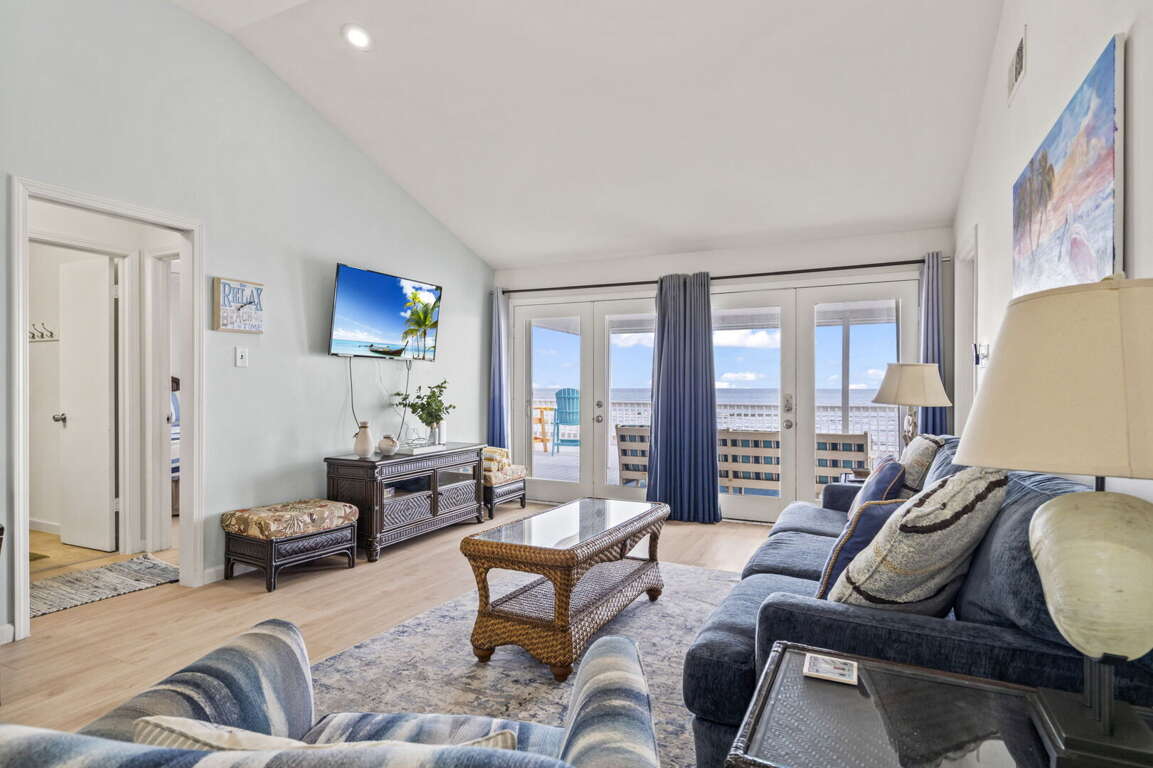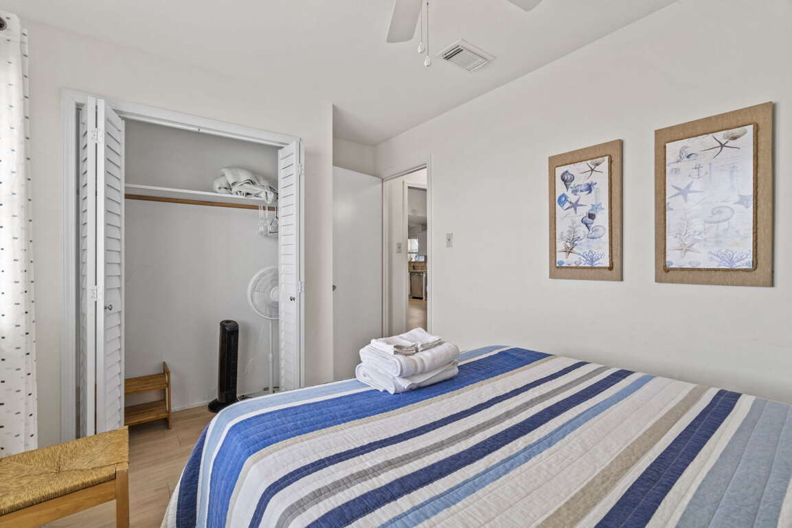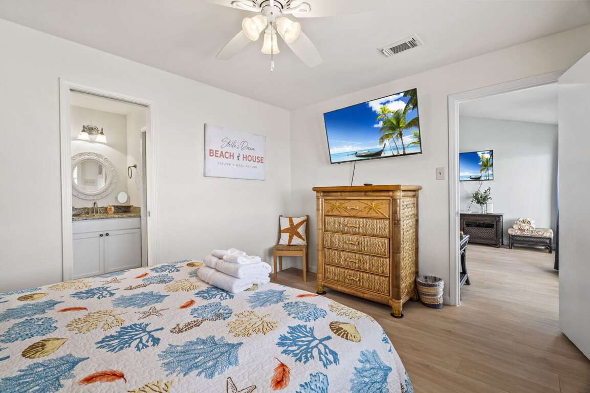 Three comfortable bedrooms provide peaceful retreats at the end of the day, each offering cozy furnishings and ample storage. The primary bedroom includes a flat-screen TV and a tranquil coastal atmosphere. Two full bathrooms are stocked with fresh linens and fluffy towels for a comfortable stay.