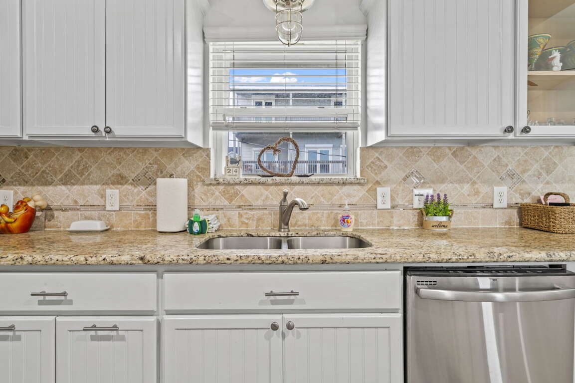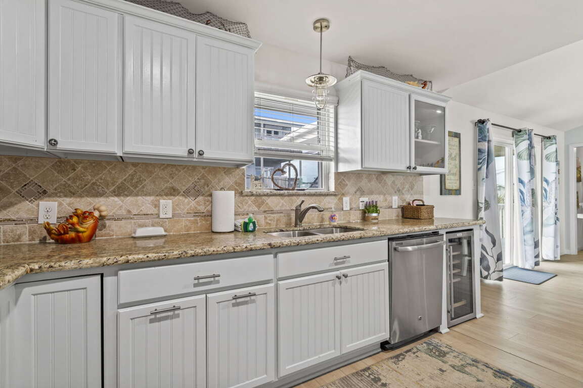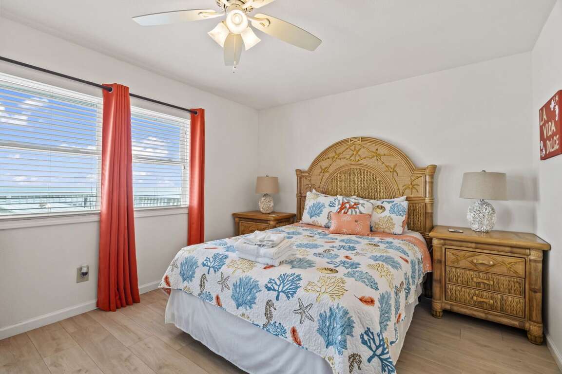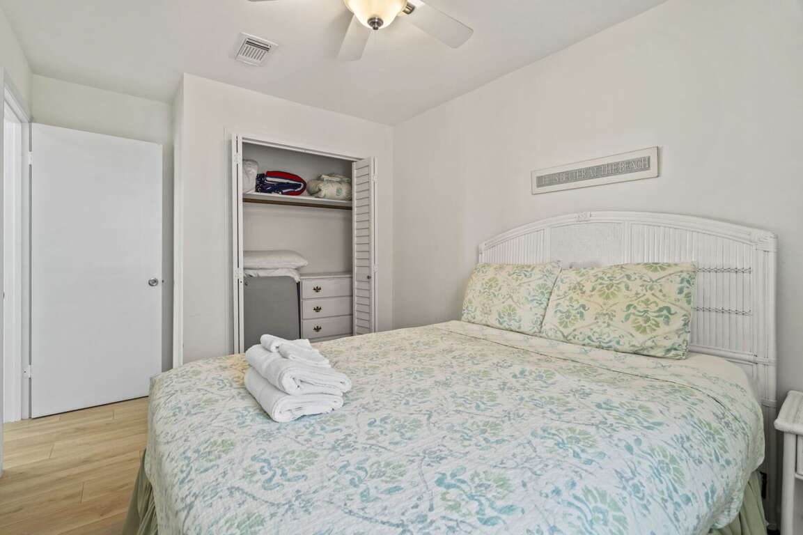 Three comfortable bedrooms provide peaceful retreats at the end of the day, each offering cozy furnishings and ample storage. The primary bedroom includes a flat-screen TV and a tranquil coastal atmosphere. Two full bathrooms are stocked with fresh linens and fluffy towels for a comfortable stay.