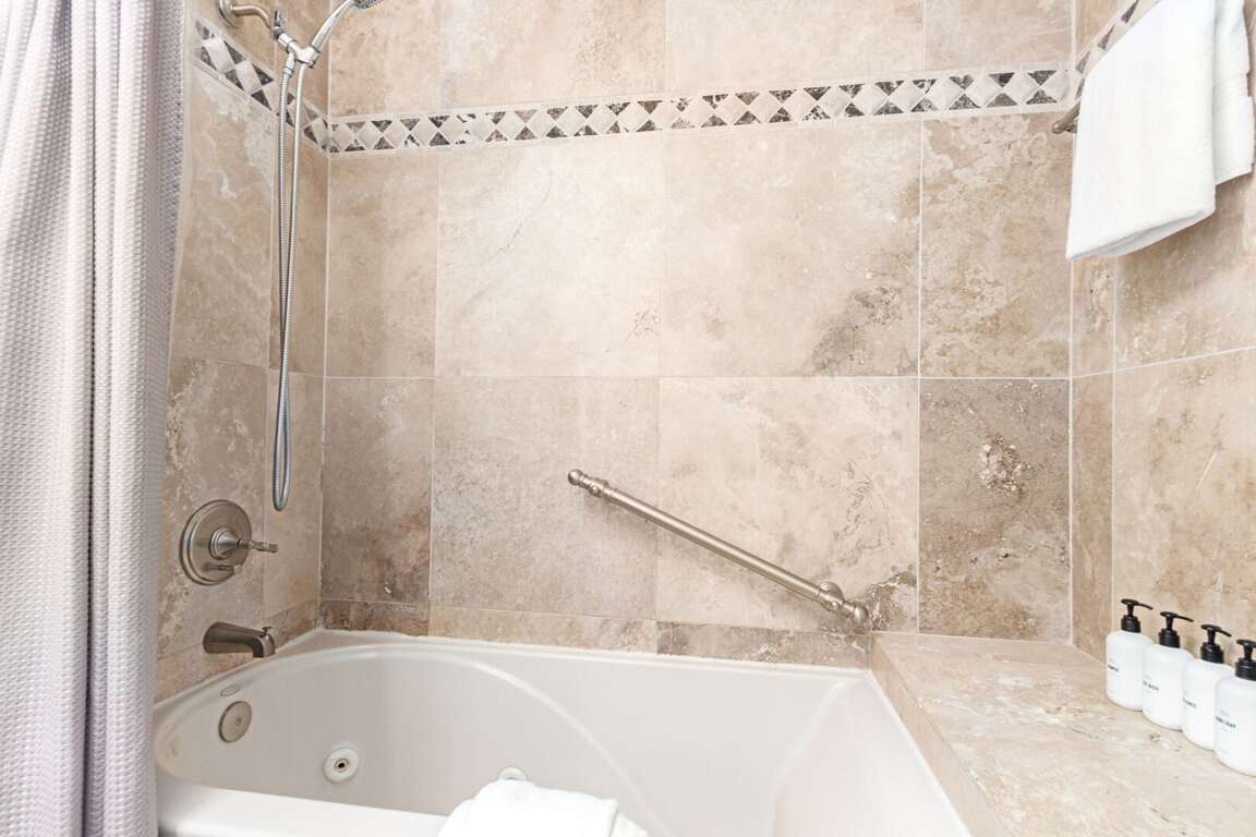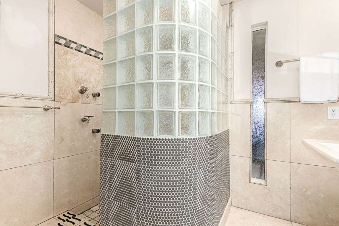 Master Suite – King bed, luxury pillows and linens, and Smart TV. The private bathroom has dual sinks, custom shower — a truly tranquil space. Master suite includes a workspace and printer.