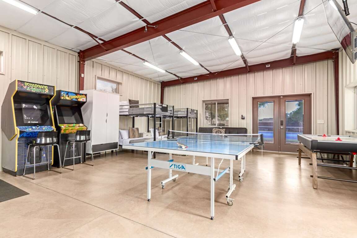 Arcade Room – (separate from main house) Loaded with two full-size stand-up retro arcades with more than 400 classic arcade games, air hockey, ping pong table, pop-a-shot basketball, large screen Smart TV, two sets of Twin over twin bunkbeds, and