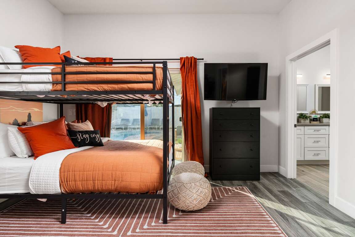 Each bedroom is designed as a private retreat, blending comfort with personality. Plush mattresses, cozy linens, and blackout curtains help ensure restful nights after full days in the sun. With a mix of king bedrooms, a double-queen room, and a spacious bunk room, the layout is ideal for both adults and kids.