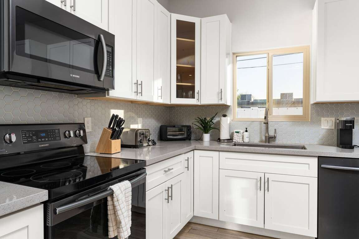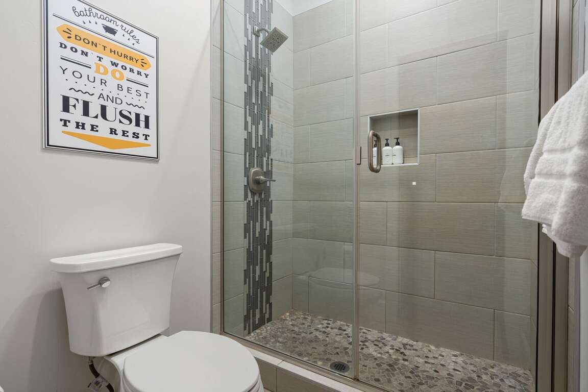 The home features modern bathrooms with clean finishes, walk-in showers, and dual vanities in select spaces. Fresh towels and toiletries are provided, along with an in-home washer and dryer to make longer stays effortless.