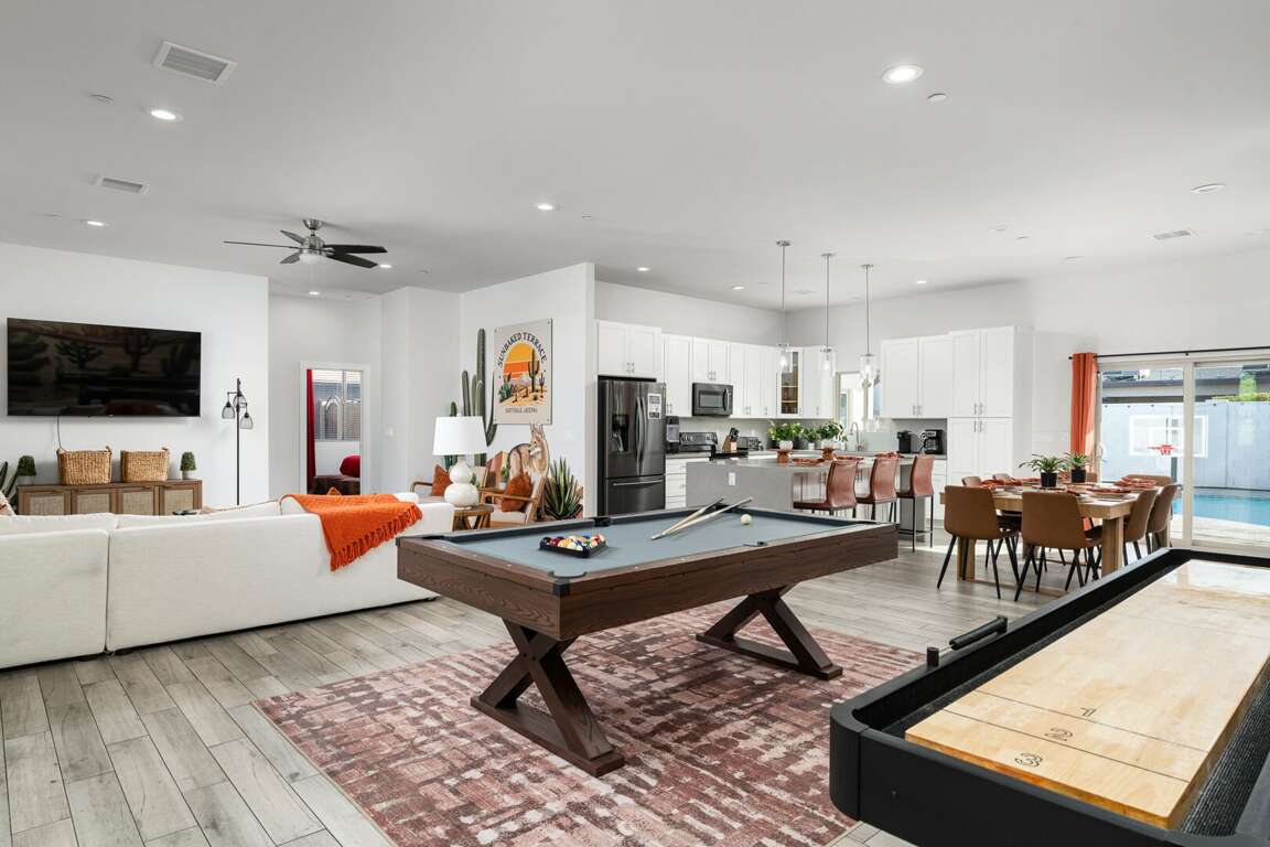 The living room is designed for comfort and connection, featuring plush seating and a large smart TV—ideal for movie nights or downtime between adventures. Just steps away, the game area adds energy to the home with a pool table and shuffleboard, offering built-in entertainment for all ages.