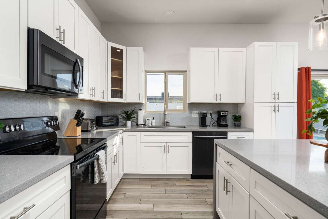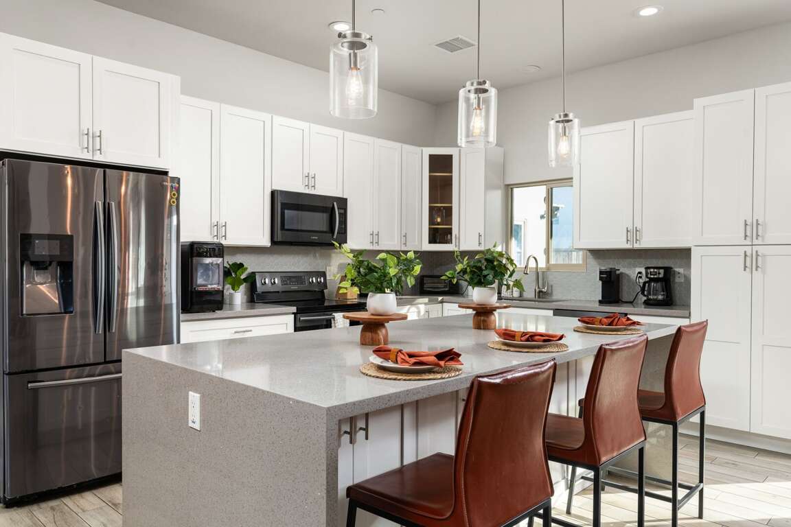 The heart of the home is the open-concept living space, where cooking, dining, and lounging come together seamlessly. The modern kitchen anchors the room with a large quartz island, perfect for morning coffee, group meals, or evening cocktails. Stylish pendant lighting and bar seating keep the space social and inviting.