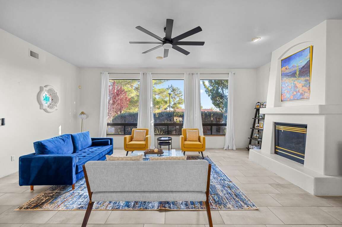 Floor-to-ceiling windows frame the incredible red rock formations while stylish furnishings and colorful accents create a warm, welcoming atmosphere.