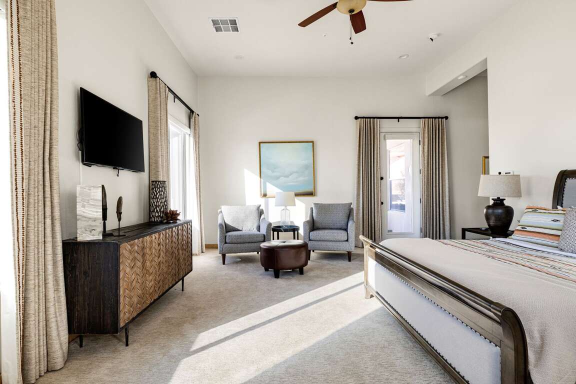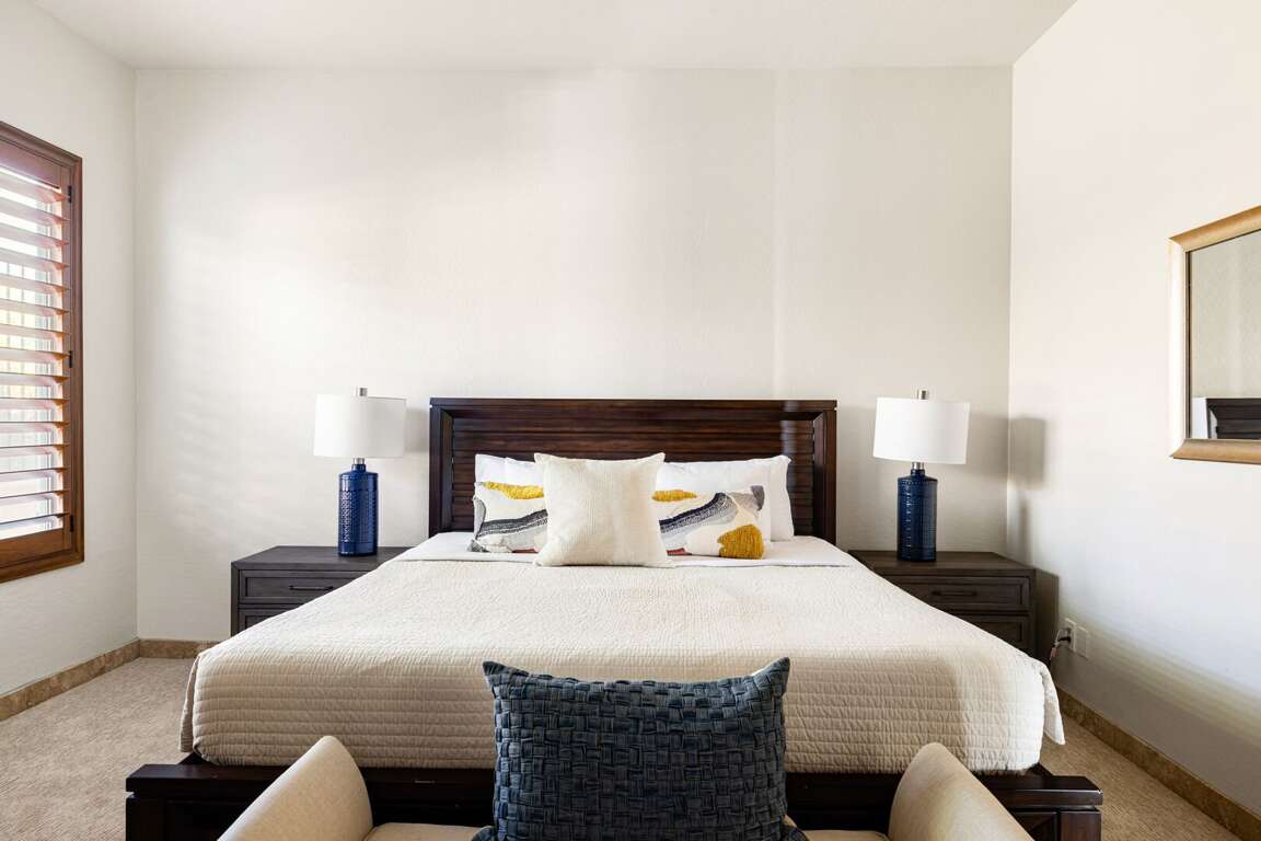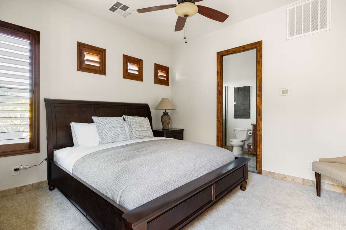 Primary Bedroom: King bed, en suite bathroom, direct patio access