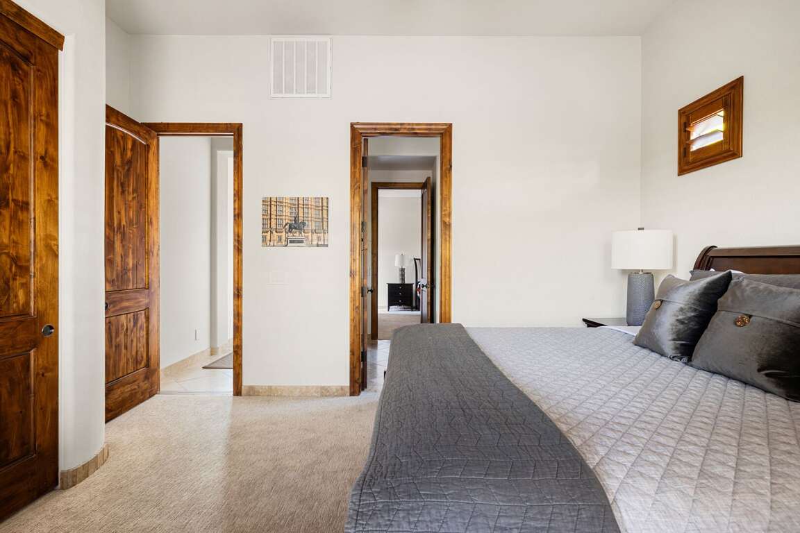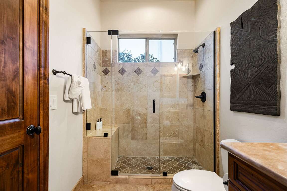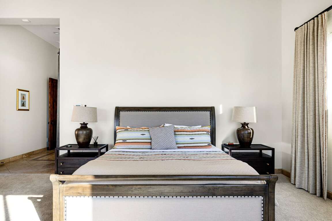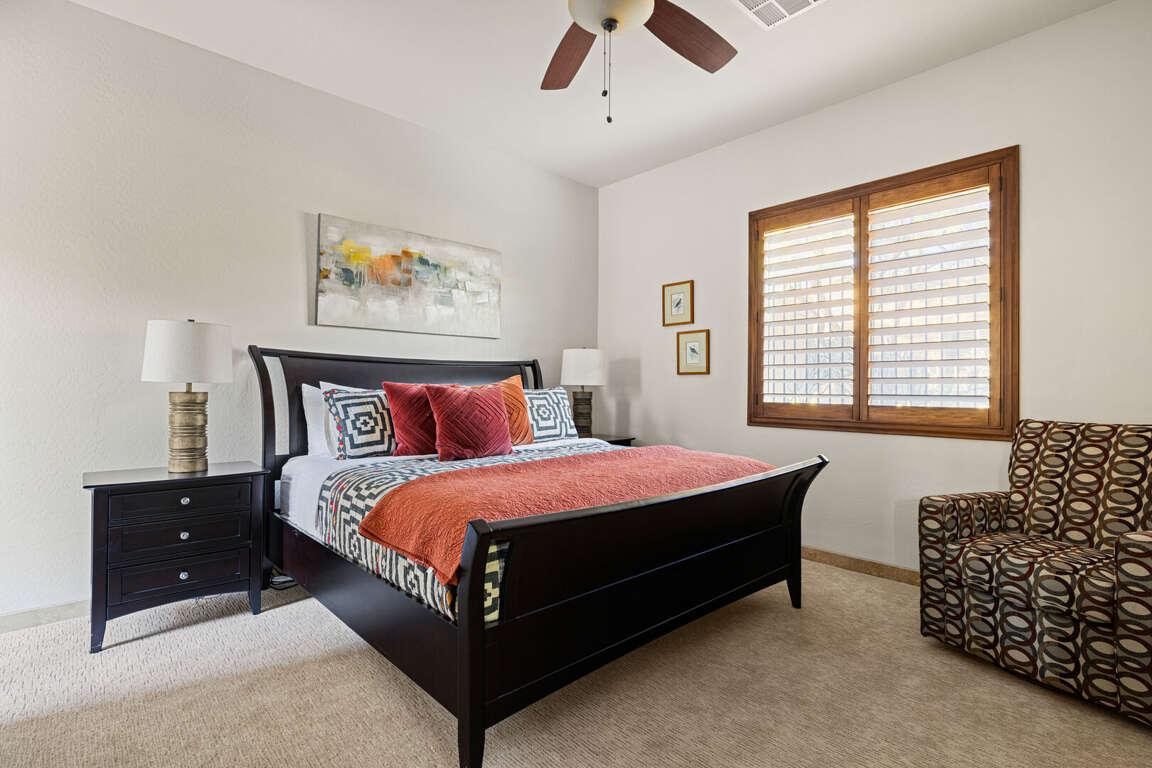 Primary Bedroom: King bed, en suite bathroom, direct patio access