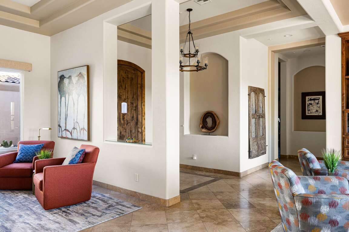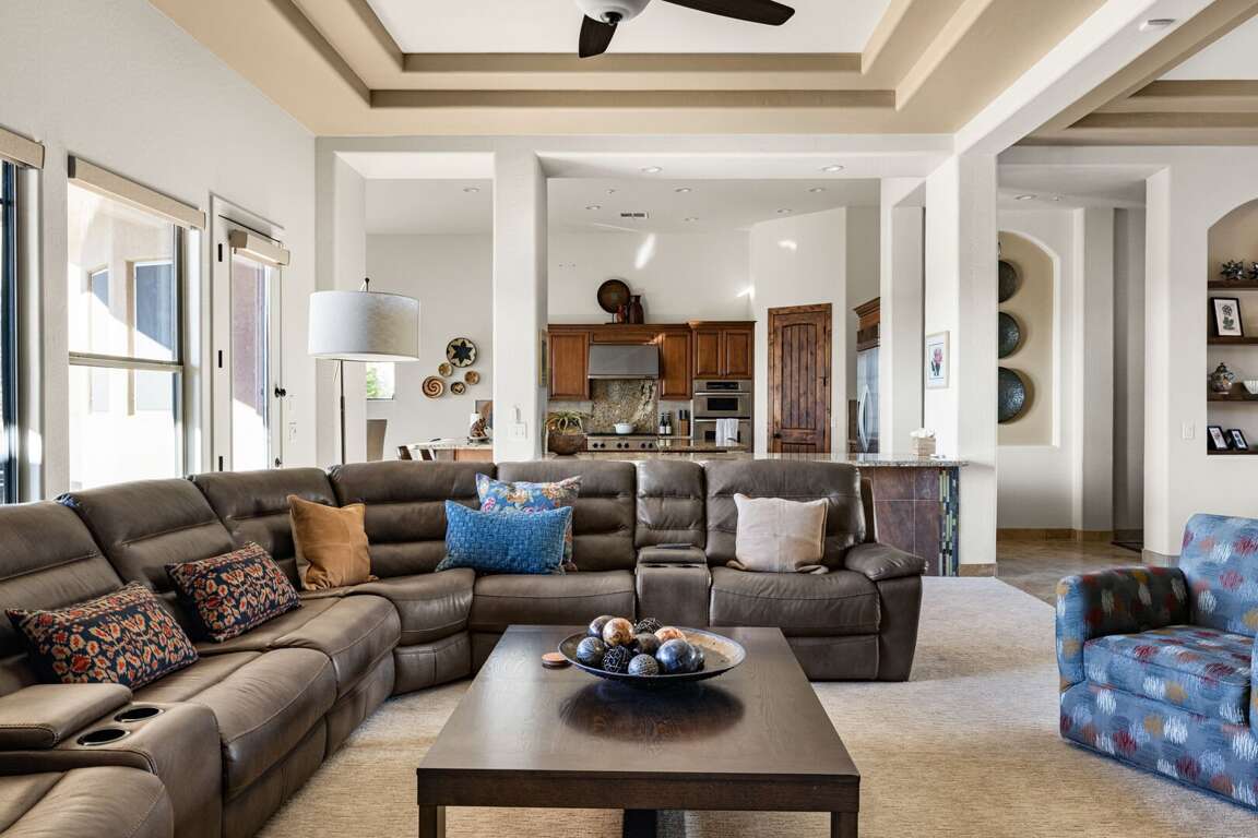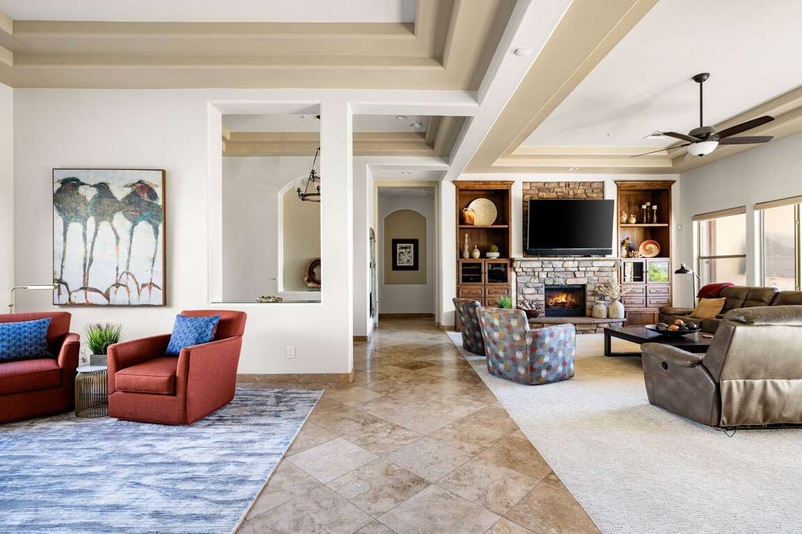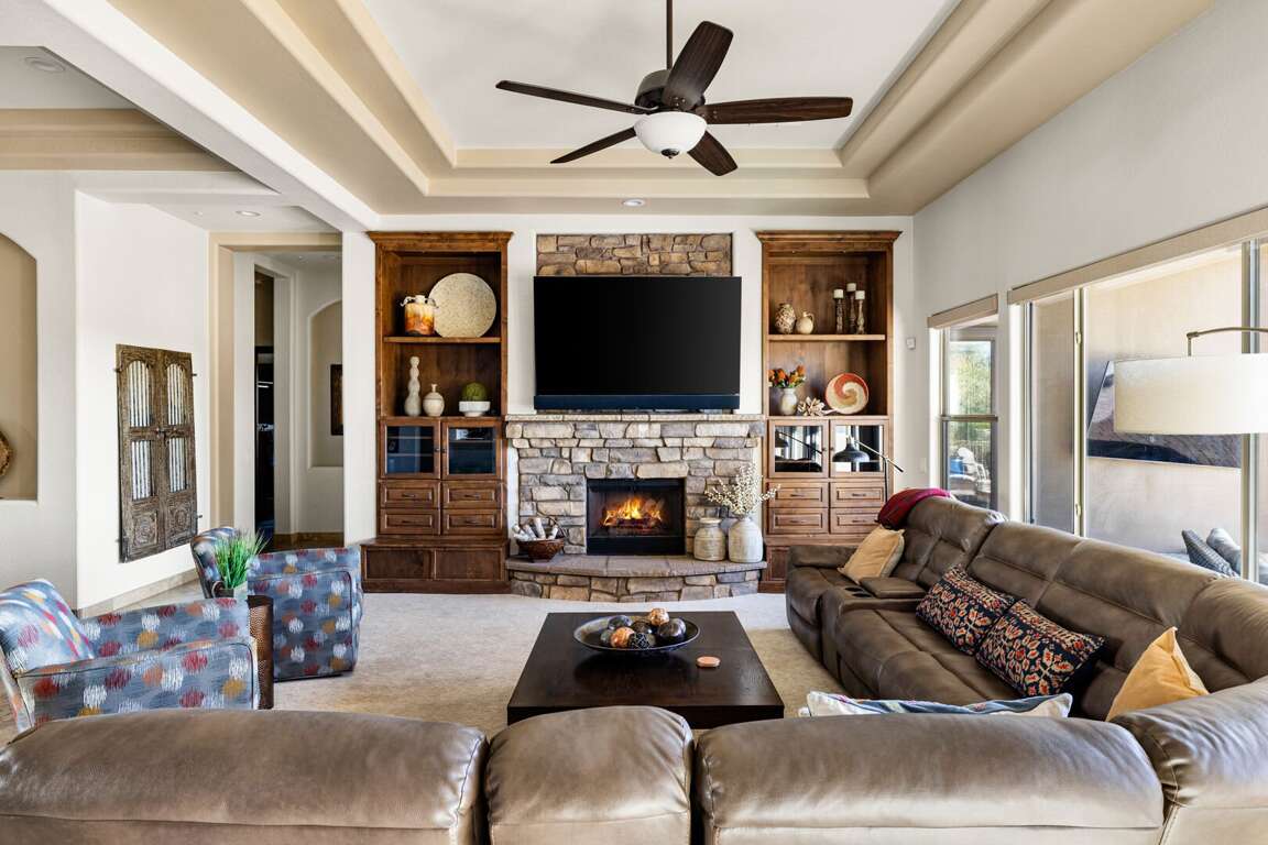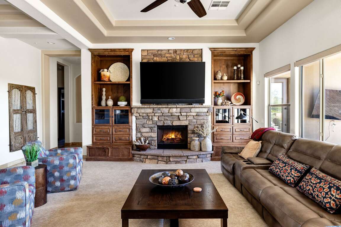 Welcome to your desert escape — a beautifully designed home that blends Southwest charm with modern comfort. The open living room features plush reclining seating, a cozy fireplace, and a large smart TV — perfect for unwinding after a day on the course.