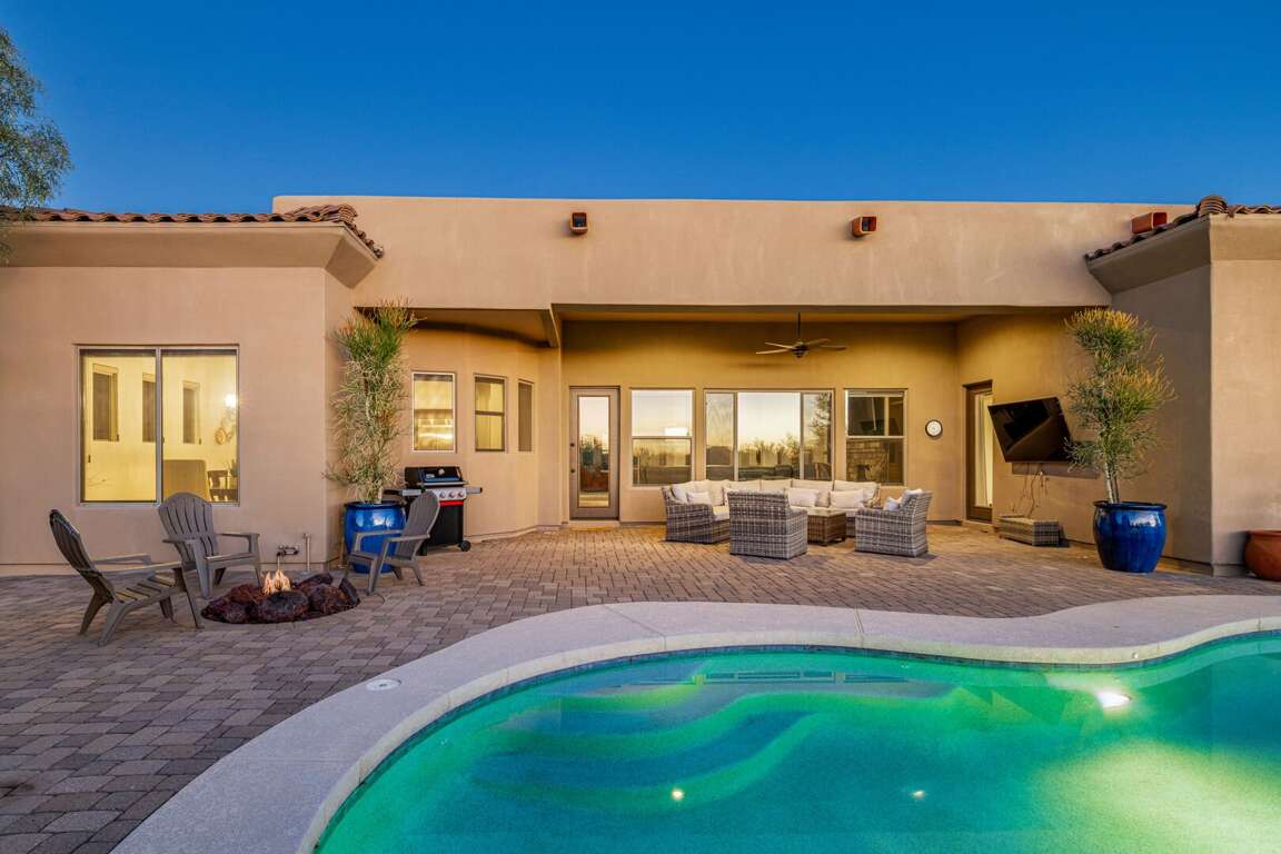 The backyard is your private resort — complete with a sparkling pool, lounge chairs, a fire pit, and a shaded outdoor seating area with a TV for catching the big game. Whether you’re swimming, grilling, or relaxing by the fire under the stars, this home delivers the ideal blend of comfort and desert tranquility.