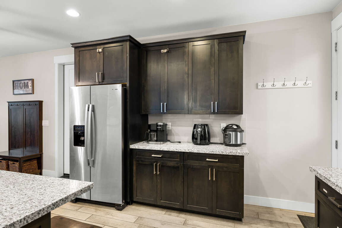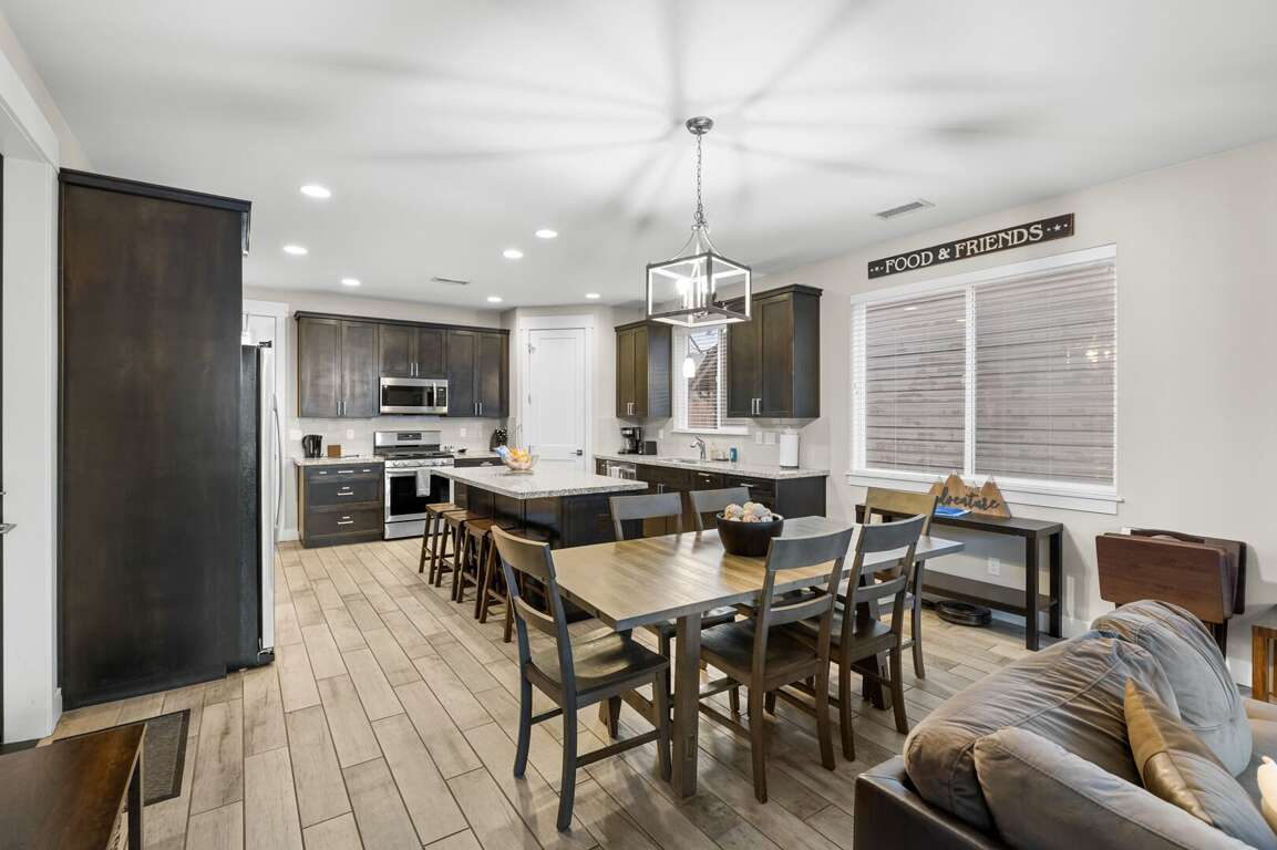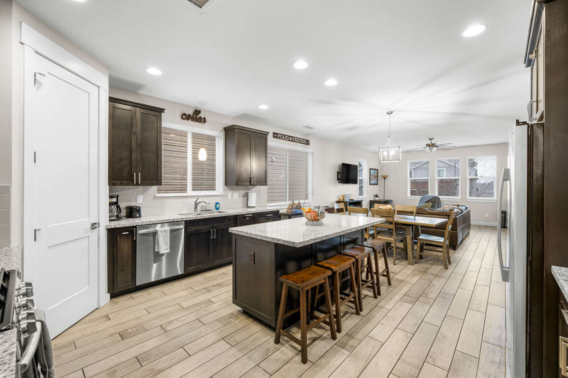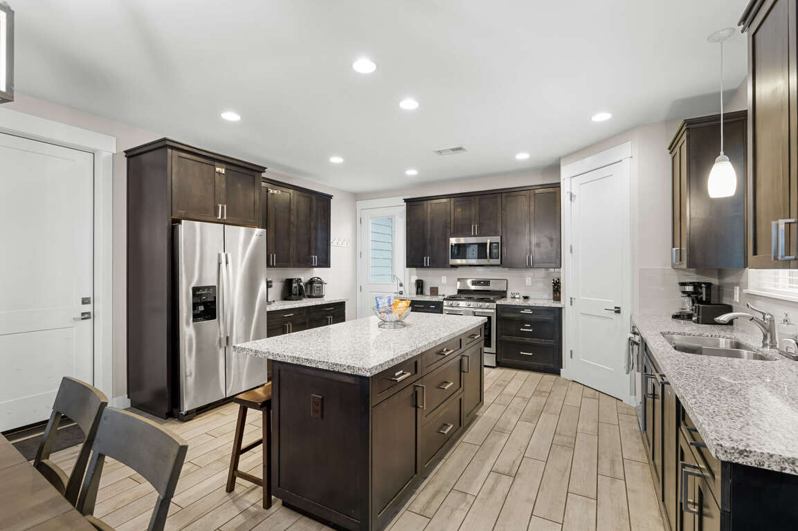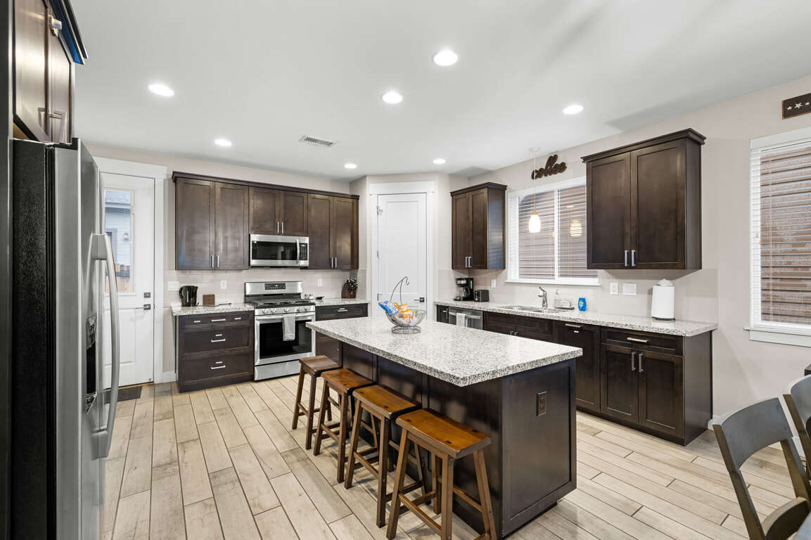 KITCHEN: Refrigerator, stove/oven, microwave, dishware & flatware, spices, blender, cooking basics, breakfast bar seating