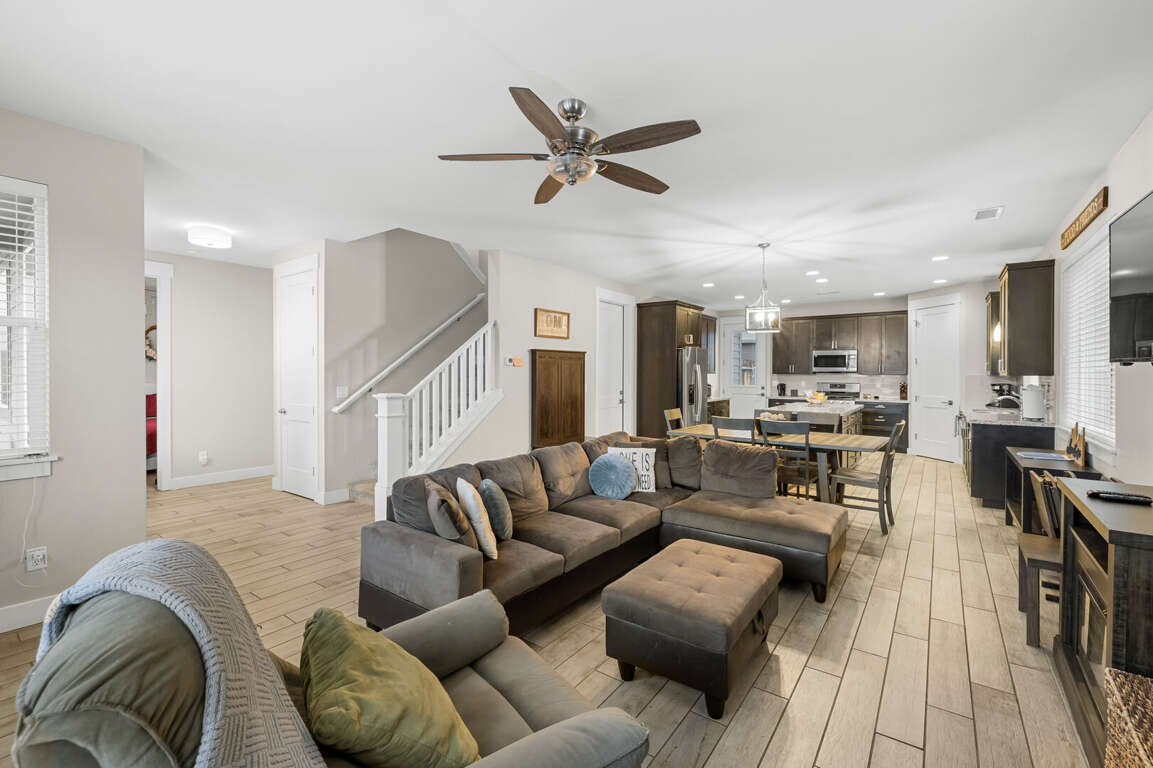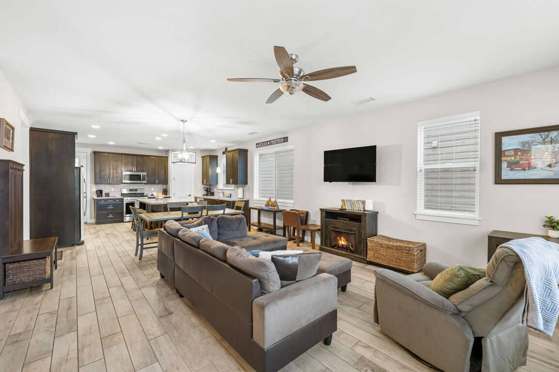 INDOOR LIVING: Electric fireplace, dining table, workspaces, board games, books, ceiling fans