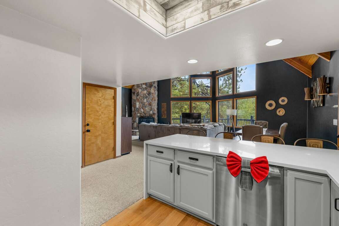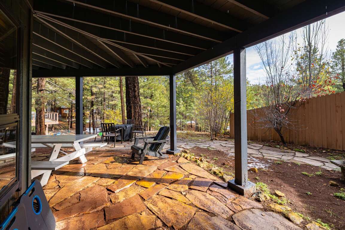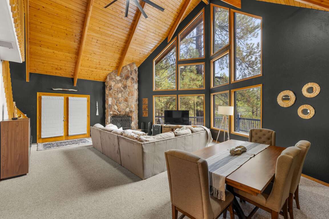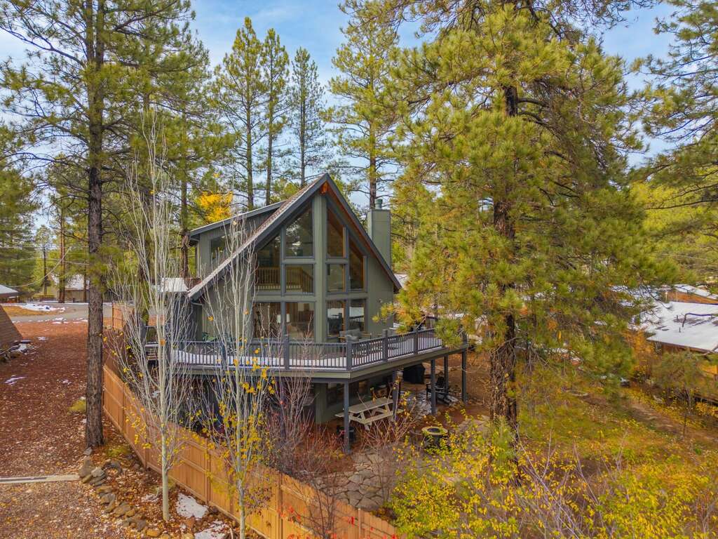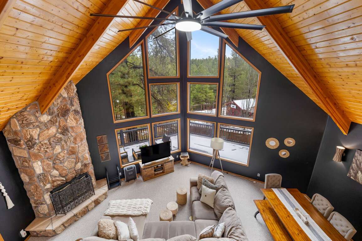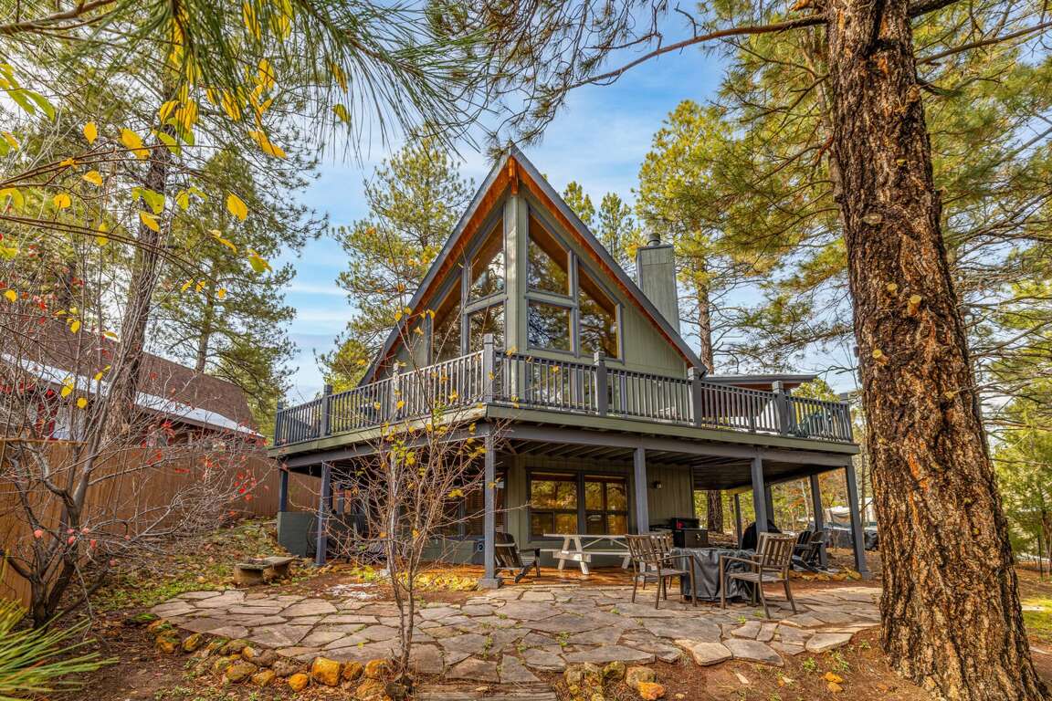 This mountain-modern A-frame blends classic cabin charm with bright, airy living. Floor-to-ceiling windows and soaring ceilings bring the outdoors in, while warm wood tones and cozy gathering areas make it easy to settle into vacation mode. Step outside to a spacious wraparound deck and flagstone patio surrounded by trees—ideal for morning coffee, sunset dinners, or stargazing under crisp Northern Arizona skies.
